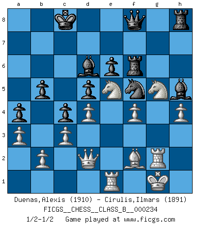 Last move : 1/2-1/2 2015 December 17 18:34:7 [Event "FICGS__CHESS__CLASS_B__000234"] [Site "FICGS"] [Date "2015.11.27"] [Round "1"] [White "Duenas,Alexis"] [Black "Cirulis,Ilmars"] [Result "1/2-1/2"] [WhiteElo "1910"] [BlackElo "1891"] 1.d4 a6 2.e4 e6 3.Nc3 d5 4.Bd3 Nf6 5.e5 Nfd7 6.Nce2 c5 7.c3 b5 8.f4 g6 9.Nf3 c4 10.Bc2 h5 11.Ng5 Nb6 12.Ng1 a5 13.N1f3 Nc6 14.O-O Ne7 15.Qe1 Nf5 16.Rb1 a4 17.Nh4 Qe7 18.Bxf5 gxf5 19.a3 Bh6 20.Nhf3 Nd7 21.Be3 Nf8 22.Kh1 Ng6 23.Rg1 Bg7 24.g3 Bd7 25.Kg2 O-O-O 26.Kf1 Rdg8 27.Kf2 h4 28.g4 fxg4 29.Rxg4 f6 30.exf6 Qxf6 31.Qd2 Bf8 32.Ne5 Be8 33.h3 Ne7 34.Kg1 Nf5 35.Bf2 Bd6 36.Re1 Ng7 37.Bxh4 Nf5 38.Bf2 Qh6 39.h4 Rf8 40.Nef3 Rf6 41.Rg2 Bh5 42.Ne5 Qf8 1/2-1/2 Queen's pawn Kingside Castling by player White (move 14) Queenside Castling by player Black (move 25) This chess game ended in a draw. Follow this game move after move (download)Alekhine is a poet who creates a work of art out of something that would hardly inspire another man to send home a picture post card. (Max Euwe) Um dein Spiel zu verbessern musst du zuallererst das Endspiel studieren, denn diese kann unabhängig studiert werden. Die Eröffnung und das Mittelspiel müssen immer in Bezug gesetzt werden zum Endspiel. (José Raúl Capablanca) Fischer es una tragedia del Ajedrez Americano a la par con Morphy y Pillsbury. (Mig Greengard) La tactique est l'élément le plus important du milieu de jeu. (Siegbert Tarrasch) A bird doesn't sing because it has an answer, it sings because it has a song. (Maya Angelou)