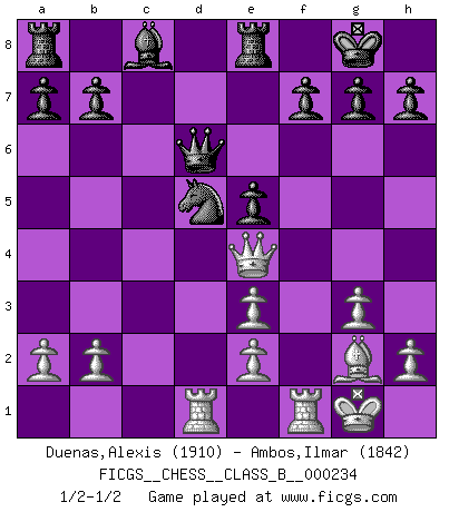 Last move : 1/2-1/2 2015 December 7 16:45:54 [Event "FICGS__CHESS__CLASS_B__000234"] [Site "FICGS"] [Date "2015.11.27"] [Round "1"] [White "Duenas,Alexis"] [Black "Ambos,Ilmar"] [Result "1/2-1/2"] [WhiteElo "1910"] [BlackElo "1842"] 1.d4 d5 2.c4 e6 3.Nf3 Nf6 4.g3 c6 5.Bg2 dxc4 6.Ne5 c5 7.Be3 Nd5 8.Nc3 Nxe3 9.fxe3 Nd7 10.Nxc4 Be7 11.dxc5 Bxc5 12.Nd6+ Bxd6 13.Qxd6 Qe7 14.Qd4 e5 15.Qa4 O-O 16.Nd5 Qd6 17.Rd1 Nb6 18.Qe4 Re8 19.O-O Nxd5 1/2-1/2 Queen's gambit declined Kingside Castling by player Black (move 15) Kingside Castling by player White (move 19) This chess game ended in a draw. Follow this game move after move (download)Chess is the gymnasium of the mind. (Blaise Pascal) Ich bin stolz ein Bulgare zu sein. (Veselin Topalov) Botvinnik trataba de restarle el misterio al Ajedrez, siempre relacionandolo a situaciones de la vida ordinaria. El gustaba de llamar al Ajedrez un típico problema inexacto similar a aquellos de los cuales la gente siempre tiene que enfrentarse en la vida cotidiana. (Garry Kasparov) L'ordinateur a tué l'originalité. Il n'y a plus guère d'aventures sur l'échiquier. (Jacob Murray) If you know the enemy and know yourself you need not fear the results of a hundred battles. (Sun Tzu)