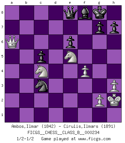Last move : 1/2-1/2 2016 January 10 20:8:34 [Event "FICGS__CHESS__CLASS_B__000234"] [Site "FICGS"] [Date "2015.11.27"] [Round "1"] [White "Ambos,Ilmar"] [Black "Cirulis,Ilmars"] [Result "1/2-1/2"] [WhiteElo "1842"] [BlackElo "1891"] 1.d4 a6 2.e4 e6 3.c4 d5 4.Nd2 dxc4 5.Bxc4 Qxd4 6.Ngf3 Qd7 7.O-O Nf6 8.Qe2 b5 9.Bd3 c5 10.b3 Nc6 11.Bb2 Be7 12.a4 bxa4 13.Rxa4 O-O 14.Bxa6 Rxa6 15.Rxa6 Bxa6 16.Qxa6 Rd8 17.h3 Nb4 18.Qb6 Nd3 19.Bc3 Nh5 20.Nc4 Nhf4 21.Kh2 Ne2 22.Nfe5 Qe8 23.Nxd3 Rb8 24.Qa6 Nxc3 25.Nde5 Rxb3 26.Nc6 Bf8 27.f4 Rb1 28.Rxb1 Nxb1 29.Qb7 f6 30.e5 fxe5 31.N6xe5 Nc3 32.Qa6 Ne2 33.Nd3 Nc3 34.Nde5 1/2-1/2 Queen's pawn Kingside Castling by player White (move 7) Kingside Castling by player Black (move 13) This chess game ended in a draw. Follow this game move after move (download)I'm not afraid of Spassky. The world knows I'm the best. You don't need a match to prove it. (Bobby Fischer) Es gibt nur zwei wahre Schachgenies - das andere war Wilhelm Steinitz, der Weltmeister von 1872 bis 1894. (Robert James Fischer) Observen a Garry Kasparov. Después de una derrota, invariablemente el gana la próxima partida. Prácticamente hace pedazos a su siguiente oponente. Eso es algo que tenemos que aprender a lograr. (Maurice Ashley) Pour moi, les échecs ne sont pas un jeu mais un art. (Alexandre Alekhine) The man who strikes first admits that his ideas have given out. (Chinese proverb)