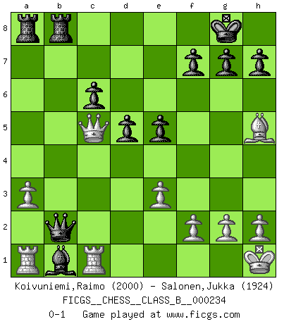 Last move : 0-1 2016 January 29 4:8:15 [Event "FICGS__CHESS__CLASS_B__000234"] [Site "FICGS"] [Date "2015.11.27"] [Round "1"] [White "Koivuniemi,Raimo"] [Black "Salonen,Jukka"] [Result "0-1"] [WhiteElo "2000"] [BlackElo "1924"] 1.d4 d5 2.Nf3 Nf6 3.c4 e6 4.c5 b6 5.b4 a5 6.Ba3 axb4 7.Bxb4 Nc6 8.Ba3 bxc5 9.Bxc5 Bxc5 10.dxc5 O-O 11.e3 Ne4 12.Bb5 Nb4 13.O-O c6 14.Be2 Qf6 15.Nd4 e5 16.Nb3 Qg6 17.a3 Bh3 18.Bf3 Na6 19.Kh1 Bf5 20.Qc1 Rfb8 21.Bd1 Nexc5 22.Nxc5 Nxc5 23.Qxc5 Bxb1 24.Bh5 Qc2 25.Rc1 Qb2 0-1 Queen's pawn game Kingside Castling by player Black (move 10) Kingside Castling by player White (move 13) Player Black won this chess game. Follow this game move after move (download)I still hope to kill Fischer. (Boris Spassky) Stil? Ich habe keinen Stil! (Anatoly Karpov) El Ajedrez es parte de una cultura y si una cultura esta en decadencia, entonces también el Ajedrez declinará. (Mikhail Botvinnik) Un millionnaire : 'Monsieur Steinitz ! Vous ne participez aux tournois que pour l'argent, alors que moi je n'y viens que pour l'honneur.' Steinitz : 'Chacun joue pour ce qu'il n'a pas'... There's always a bigger fish. (Qui-Gon Jinn in Star Wars ep.1)