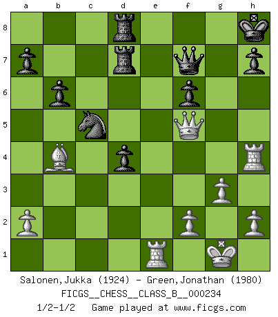 Last move : 1/2-1/2 2016 April 6 11:23:31 [Event "FICGS__CHESS__CLASS_B__000234"] [Site "FICGS"] [Date "2015.11.27"] [Round "1"] [White "Salonen,Jukka"] [Black "Green,Jonathan"] [Result "1/2-1/2"] [WhiteElo "1924"] [BlackElo "1980"] 1.e4 e6 2.d4 d5 3.e5 c5 4.c3 Qb6 5.Nf3 Nc6 6.Be2 cxd4 7.cxd4 Nge7 8.Nc3 Nf5 9.Na4 Qa5+ 10.Nc3 Qb6 11.Na4 Qa5+ 12.Nc3 Bb4 13.O-O Bxc3 14.bxc3 Qxc3 15.Bd2 Qa3 16.Bc1 Qb4 17.Bd2 Qe7 18.Bg5 f6 19.exf6 gxf6 20.Bc1 O-O 21.Re1 Kh8 22.Bd3 Qf7 23.Bxf5 exf5 24.Bh6 Rg8 25.g3 f4 26.Bxf4 Bg4 27.Qb3 Rad8 28.Rab1 Rd7 29.Qc3 Bxf3 30.Qxf3 Nxd4 31.Qd3 Ne6 32.Bd2 d4 33.Rb5 Rc8 34.Rf5 Ng7 35.Rf4 Ne6 36.Rh4 Rcd8 37.Bb4 b6 38.Qf5 Nc5 1/2-1/2 French : Advance variation Kingside Castling by player White (move 13) Kingside Castling by player Black (move 20) This chess game ended in a draw. Follow this game move after move (download)No price is too great for the scalp of the enemy King. (Koblentz) Unter Putin wird alles Geld aus Russland wie von einem Staubsauger nach Moskau umgeleitet, das ist wie ein schwarzes Loch. (Garry Kasparov) El Ajedrez es un mar en el cual un mosquito puede beber y un elefante puede bañarse. (Refrán Hindú) Le jeu d'échecs fait naître et fortifie en nous plusieurs qualités précieuses dans le cours de l'existence, telles que la prévoyance, la circonspection, la prudence, et la persévérance. (Benjamin Franklin - 1783, la morale des échecs) There is no instance of a country having benefited from prolonged warfare. (Sun Tzu)
