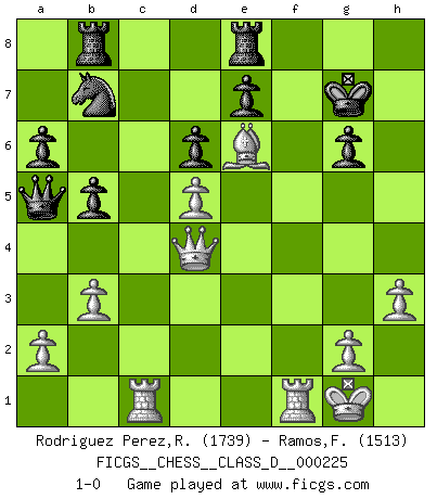 Last move : 1-0 2015 December 16 3:42:19 [Event "FICGS__CHESS__CLASS_D__000225"] [Site "FICGS"] [Date "2015.11.28"] [Round "1"] [White "Rodriguez Perez,Rene"] [Black "Ramos,Francis"] [Result "1-0"] [WhiteElo "1739"] [BlackElo "1513"] 1.e4 c5 2.Nf3 d6 3.d4 cxd4 4.Qxd4 a6 5.c4 Nc6 6.Qd2 Nf6 7.Nc3 g6 8.b3 Bg7 9.Bb2 O-O 10.h3 Be6 11.Bd3 Nd7 12.O-O Rc8 13.Nd5 Nce5 14.Nxe5 Nxe5 15.Be2 Re8 16.Rac1 f5 17.exf5 Bxf5 18.Ne3 Be4 19.Rcd1 Qc7 20.f4 Nc6 21.Bxg7 Kxg7 22.Nd5 Bxd5 23.cxd5 Nd8 24.Qd4+ Kg8 25.Bg4 Rb8 26.Rc1 Qa5 27.f5 b5 28.fxg6 hxg6 29.Qf4 Nb7 30.Be6+ Kg7 31.Qd4+ 1-0 Sicilian, Chekhover variation Kingside Castling by player Black (move 9) Kingside Castling by player White (move 12) Player White won this chess game. Follow this game move after move (download)Life is like a game of Chess, changing with each move. (Chinese proverb) Heutzutage gewinnt im Turnier nicht derjenige Spieler, der weitreichende Pläne entwirft, sondern einfach jener, der Zug um Zug kämpft. (David Bronstein) Fischer es una tragedia del Ajedrez Americano a la par con Morphy y Pillsbury. (Mig Greengard) Les échecs sont un jeu terrible. Si vous n'avez pas le centre, votre adversaire a une position plus libre. Par contre, si vous avez le centre, alors vous avez vraiment quelque chose pour laquelle vous inquiéter ! (Siegbert Tarrasch) Panic is a sudden desertion of us, an a going over to the enemy of our imagination. (Christian Nevell Bovee)