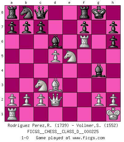 Last move : 1-0 2015 December 17 23:34:42 [Event "FICGS__CHESS__CLASS_D__000225"] [Site "FICGS"] [Date "2015.11.28"] [Round "1"] [White "Rodriguez Perez,Rene"] [Black "Vollmer,Steve"] [Result "1-0"] [WhiteElo "1739"] [BlackElo "1552"] 1.e4 e5 2.f4 exf4 3.Nf3 Be7 4.Bc4 d6 5.d4 Nf6 6.Nc3 Nc6 7.Bxf4 Bg4 8.O-O O-O 9.Qd2 Qd7 10.d5 Nb8 11.e5 dxe5 12.Nxe5 Bc5+ 13.Kh1 Qc8 14.Bh6 gxh6 15.Rxf6 Bd6 16.Bd3 1-0 KGA : Cunningham defense Kingside Castling by player White (move 8) Kingside Castling by player Black (move 8) Player White won this chess game. Follow this game move after move (download)Fischer is under obligation to nobody. (Joseph Platz) Ein unbeabsichtigtes Patt ist der Gipfel der Dummheit. (Anonymous) El poder defensivo de una pieza clavada, solamente es imaginario. (Aaron Nimzovich) Les ravages du H expliquent la différence de niveau entre Tal et Thal [Abergel]. I take risks, sometimes patients die, but not taking risks causes more patients to die. So I guess my biggest problem is I've been cursed with the ability to do the math. (Gregory House, House M.D.)