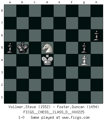 Last move : 1-0 2016 January 31 11:43:32 [Event "FICGS__CHESS__CLASS_D__000225"] [Site "FICGS"] [Date "2015.11.28"] [Round "1"] [White "Vollmer,Steve"] [Black "Foster,Duncan"] [Result "1-0"] [WhiteElo "1552"] [BlackElo "1494"] 1.d4 b6 2.e4 Bb7 3.Nc3 a6 4.Nf3 h6 5.Bd3 e6 6.O-O g6 7.Be3 Bg7 8.Qd2 Ne7 9.a4 g5 10.d5 e5 11.Qe2 d6 12.Nd1 O-O 13.c4 c5 14.Nc3 Bc8 15.Qc2 f5 16.exf5 Bxf5 17.h3 Bxd3 18.Qxd3 Nd7 19.Ne4 Nf6 20.Bd2 Qd7 21.Bc3 Nh5 22.Rfe1 Nf4 23.Qe3 Neg6 24.Kh2 Nxg2 25.Kxg2 Nf4+ 26.Kg1 Qxh3 27.Nh4 Qxh4 28.Qg3 Qxg3+ 29.fxg3 Nd3 30.Rf1 Rxf1+ 31.Rxf1 Rd8 32.Rf3 Nc1 33.Kf2 Rf8 34.Nxd6 Nb3 35.Rxf8+ Bxf8 36.Nc8 Nd4 37.Nxb6 Kf7 38.g4 Ke7 39.b4 Kd6 40.bxc5+ Kxc5 41.Nd7+ Kxc4 42.Bxd4 Kxd4 43.Nxf8 Kxd5 44.Ke3 a5 45.Nd7 Kd6 46.Nf6 Kc5 47.Ke4 Kb4 48.Nd5+ Kxa4 49.Kxe5 Kb5 50.Kd4 1-0 Queen's pawn : English defense Kingside Castling by player White (move 6) Kingside Castling by player Black (move 12) 10 pieces endgame at move 43 : White KNPPP , Black KPPPP WHITE : King + 1 Knight 3 Pawns BLACK : King + 4 Pawns 9 pieces endgame at move 43 : White KNPP , Black KPPPP WHITE : King + 1 Knight 2 Pawns BLACK : King + 4 Pawns 8 pieces endgame at move 48 : White KNP , Black KPPPP WHITE : King + 1 Knight 1 Pawn BLACK : King + 4 Pawns 7 pieces endgame at move 49 : White KNP , Black KPPP WHITE : King + 1 Knight 1 Pawn BLACK : King + 3 Pawns Player White won this chess game. Follow this game move after move (download)A player surprised is half beaten. (Proverb) Im Schach gibt es keinen Platz für Galanterie. (Irving Chernev) Un buen jugador siempre tiene buena suerte. (José Raúl Capablanca) L'action d'une oeuvre littéraire se déroule sur un champ de bataille. Les masques et les types du drame moderne correspondent aux pièces du jeu d'échecs. L'intrigue correspond aux coups et aux gambits, c'est à dire aux techniques du jeu telles qu'utilisées et interprétées par les joueurs. Les tactiques et les péripéties [mouvements] correspondent aux coups exécutés par l'adversaire. (Viktor Shklovsky) Macintosh - we might not get everything right, but at least we knew the century was going to end. (Douglas Adams)
