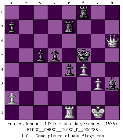 Last move : 1-0 2016 March 25 20:46:9 [Event "FICGS__CHESS__CLASS_D__000225"] [Site "FICGS"] [Date "2015.11.28"] [Round "1"] [White "Foster,Duncan"] [Black "Gouldar,Frances"] [Result "1-0"] [WhiteElo "1494"] [BlackElo "1696"] 1.e4 e5 2.Nf3 Nc6 3.d4 exd4 4.Bc4 Bb4+ 5.c3 dxc3 6.O-O cxb2 7.Bxb2 f6 8.Qb3 Nh6 9.e5 Be7 10.exf6 Bxf6 11.Re1+ Kf8 12.Nc3 d6 13.Nd5 Na5 14.Bxf6 gxf6 15.Qc3 Nxc4 16.Qxc4 c6 17.Ne3 d5 18.Qc5+ Kf7 19.h3 Qf8 20.Qc3 Nf5 21.Re2 Nxe3 22.Rxe3 Be6 23.Rae1 Re8 24.Ne5+ fxe5 25.Rf3+ Ke7 26.Qb4+ Kd7 27.Qxb7+ Kd6 28.Rxf8 Rhxf8 29.Qxh7 Re7 30.Qd3 e4 31.Qa3+ c5 32.Qa6+ Ke5 33.g3 Bxh3 34.f4+ Kf5 35.Qh6 1-0 Scotch gambit Kingside Castling by player White (move 6) Player White won this chess game. Follow this game move after move (download)Of all my Russian books, the defense contains and diffuses the greatest 'warmth' which may seem odd seeing how supremely abstract Chess is supposed to be. (Vladimir Nabokov) Schach ist Kampf, hauptsächlich jedoch gegen die eigenen Fehler. (Savielly Grigorievitsch Tartakower) El jugador táctico sabe que hacer cuando hay algo que hacer; mientras que el estratega sabe que hacer cuando no hay nada que hacer. (Gerald Abrahams) Les erreurs sont comme les malheurs, elles n'arrivent jamais seules. (Siegbert Tarrasch) Political correctness is subjecting us to gross incompetence. (Johann Piek)