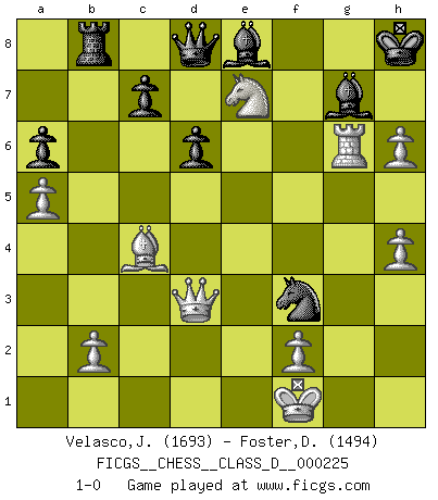 Last move : 1-0 2016 January 12 16:32:23 [Event "FICGS__CHESS__CLASS_D__000225"] [Site "FICGS"] [Date "2015.11.28"] [Round "1"] [White "Velasco,Jose Maria"] [Black "Foster,Duncan"] [Result "1-0"] [WhiteElo "1693"] [BlackElo "1494"] 1.d4 b6 2.e4 Bb7 3.Bd3 g6 4.Nf3 h6 5.a4 a6 6.a5 b5 7.c4 e6 8.d5 Bg7 9.Nc3 exd5 10.exd5 bxc4 11.Bxc4 d6 12.Bf4 Ne7 13.O-O O-O 14.Qd2 Kh7 15.Rae1 Nd7 16.Re2 Nf6 17.h3 Nh5 18.Bh2 Bc8 19.Rfe1 Ng8 20.Nd4 Qh4 21.Re4 Qg5 22.Qd3 Bd7 23.h4 Qd8 24.Ne6 fxe6 25.dxe6 Nhf6 26.e7 Nxe7 27.Rxe7 Rb8 28.Qd4 Nh5 29.Nd5 Re8 30.Qd3 Rxe7 31.Nxe7 Be8 32.g4 Nf6 33.g5 Ng4 34.Re6 Nxh2 35.Rxg6 Nf3+ 36.Kf1 Kh8 37.gxh6 1-0 Queen's pawn : English defense Kingside Castling by player White (move 13) Kingside Castling by player Black (move 13) Player White won this chess game. Follow this game move after move (download)The hardest game to win is a won game. (Emanuel Lasker) Ich organisiere ein großes Turnier, was mich etwa 120000 Dollar kostet. Ich denke, das ist das erste Mal in der Schachgeschichte, daß ein Schachgroßmeister auch als Mäzen auftritt. (Miguel Najdorf) La estratégia requiere pensar, la táctica requiere observación. (Max Euwe) Echiquier : carré parfait, comme la Jérusalem nouvelle décrite par l'auteur de l'Apocalypse, huit cases sur huit, exaltation du chiffre 4, symbole du cosmos aux quatre horizons... où le noir et le blanc, l'ombre et la lumière, le mal et le bien s'entremêlent et se conjuguent. (Robert Couffignal, Le Gambit du poète) A good teacher is like a candle - it consumes itself to light the way for others. (Author unknown)