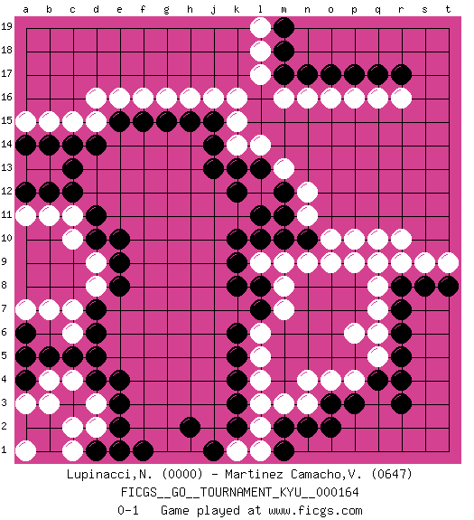 Last move : 0-1 2016 June 16 11:1:45 [Event "FICGS__GO__TOURNAMENT_KYU__000164"] [Site "FICGS"] [Date "2015.11.28"] [Round "1"] [Black "Lupinacci,Nicola"] [White "Martinez Camacho,Victor Hugo"] [Result "0-1"] [Rating 1 "0000"] [Rating 2 "0647"] 1.d4 q16 2.q4 d16 3.d10 q10 4.k4 k16 5.c13 p6 6.r6 q8 7.r8 r9 8.r7 q6 9.r5 q5 10.r4 p4 11.p3 o4 12.o3 n3 13.o2 n4 14.r3 q7 15.n2 m3 16.m2 s9 17.s8 t9 18.t8 l3 19.k3 l2 20.k2 l1 21.m1 k1 22.h2 l4 23.k5 l5 24.l7 l6 25.k6 m7 26.k8 m8 27.m10 m9 28.l10 n9 29.n10 o10 30.k10 n11 31.m11 n12 32.m12 m13 33.k12 l14 34.j14 k15 35.j15 k14 36.k13 j16 37.h15 h16 38.j13 g16 39.g15 f16 40.f15 e16 41.e15 d15 42.d14 c15 43.c14 b15 44.b14 a15 45.a14 l9 46.k9 c4 47.c5 d3 48.c3 b4 49.d5 b3 50.b5 c2 51.e3 d2 52.e2 e1 53.f1 a5 54.a6 l12 55.l13 p10 56.a4 a3 57.a5 d9 58.e9 d8 59.e8 c10 60.d11 c11 61.c12 b11 62.d7 c7 63.d6 b7 64.d1 a7 65.b12 a11 66.a12 r10 67.l11 c1 68.e1 a1 69.j1 q9 70.l8 o9 71.e10 c6 72.e4 p9 73.r17 r16 74.q17 p16 75.p17 o16 76.o17 n16 77.n17 m16 78.m17 l17 79.m18 l18 80.m19 l19 0-1 Here are the names of the openings (joseki) played in the four corners : Corner d16 : d16 c13 Hoshi (Hwajeom, Seongjeom, Xingwei`) 4-4 Point. The star or hoshi (4-4) point, emphasizing influence at the potential expense of territory. Niken Kakari (Dukan Keolch'im, E`r Gua`jiao~, 2-Space Low Approach). White typically answers by 7-3 or 3-5 (which is not joseki). Corner q4 : q4 p6 Hoshi (Hwajeom, Seongjeom, Xingwei`) 4-4 Point. The star or hoshi (4-4) point, emphasizing influence at the potential expense of territory. Player White won this Go (weiqi, baduk) game. Follow this game move after move (download)Go uses the most elemental materials and concepts - line and circle, wood and stone, black and white - combining them with simple rules to generate subtle strategies and complex tactics that stagger the imagination. (Iwamoto Kaoru, 9 dan professional Go player and former Honinbo title holder) Perception is reality. (Immanuel Kant)
