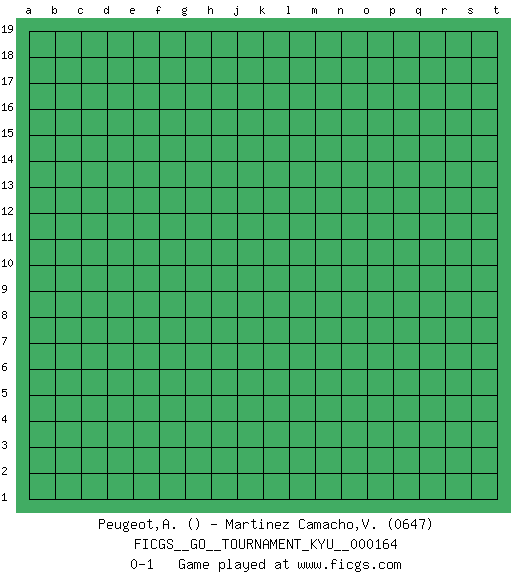 Last move : 0-1 2015 November 29 0:18:59 [Event "FICGS__GO__TOURNAMENT_KYU__000164"] [Site "FICGS"] [Date "2015.11.28"] [Round "1"] [Black "Peugeot,Alex"] [White "Martinez Camacho,Victor Hugo"] [Result "0-1"] [Rating 2 "0647"] 0-1 Here are the names of the openings (joseki) played in the four corners : Player White won this Go (weiqi, baduk) game. Follow this game move after move (download)Keep away from thickness. (Anonymous) No enterprise is more likely to succeed than one concealed from the enemy until it is ripe for execution. (Niccolo Machiavelli)