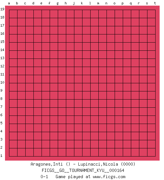 Last move : 0-1 2015 December 28 22:15:28 [Event "FICGS__GO__TOURNAMENT_KYU__000164"] [Site "FICGS"] [Date "2015.11.28"] [Round "1"] [Black "Aragones,Inti"] [White "Lupinacci,Nicola"] [Result "0-1"] [Rating 2 "0000"] 0-1 This go game has been lost on time (started : 2015.11.28 20:12:15) Here are the names of the openings (joseki) played in the four corners : Player White won this Go (weiqi, baduk) game. Follow this game move after move (download)The weak player fears ko, the strong player seeks it. (Bill Taylor) If I had no sense of humor, I would long ago have committed suicide. (Mahatma Gandhi)