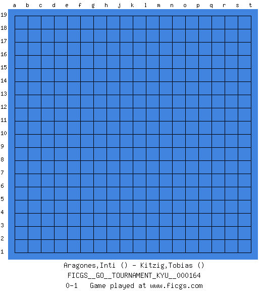 Last move : 0-1 2015 December 28 22:15:28 [Event "FICGS__GO__TOURNAMENT_KYU__000164"] [Site "FICGS"] [Date "2015.11.28"] [Round "1"] [Black "Aragones,Inti"] [White "Kitzig,Tobias"] [Result "0-1"] 0-1 This go game has been lost on time (started : 2015.11.28 20:12:15) Here are the names of the openings (joseki) played in the four corners : Player White won this Go (weiqi, baduk) game. Follow this game move after move (download)Five groups might live but the six will die. (Anonymous) If you ain't just a little scared when you enter a casino, you are either very rich or you haven't studied the games enough. (Pappy)
