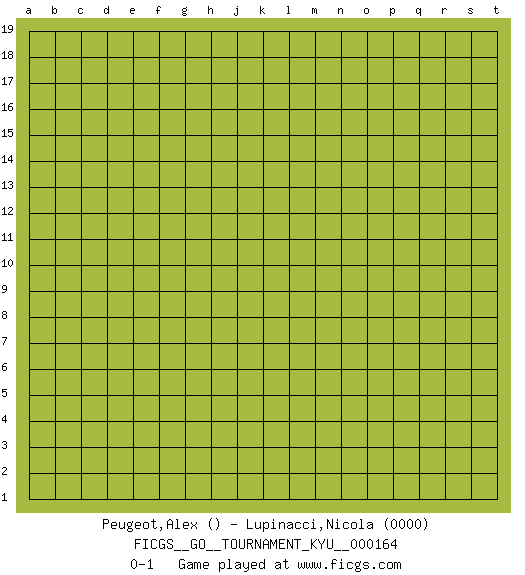 Last move : 0-1 2015 November 29 9:7:46 [Event "FICGS__GO__TOURNAMENT_KYU__000164"] [Site "FICGS"] [Date "2015.11.28"] [Round "1"] [Black "Peugeot,Alex"] [White "Lupinacci,Nicola"] [Result "0-1"] [Rating 2 "0000"] 0-1 Here are the names of the openings (joseki) played in the four corners : Player White won this Go (weiqi, baduk) game. Follow this game move after move (download)Do not fear furikawari. (Anonymous) There is a very easy way to return from a casino with a small fortune : go there with a large one. (Jack Yelton)