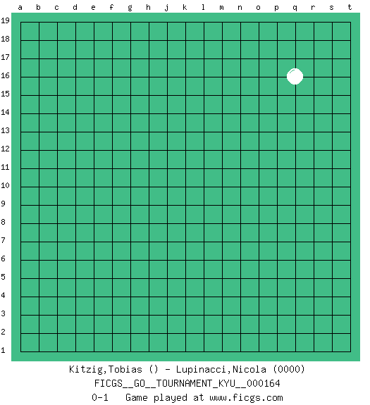 Last move : 0-1 2015 December 27 8:10:40 [Event "FICGS__GO__TOURNAMENT_KYU__000164"] [Site "FICGS"] [Date "2015.11.28"] [Round "1"] [Black "Kitzig,Tobias"] [White "Lupinacci,Nicola"] [Result "0-1"] [Rating 2 "0000"] 1.g2-g3 q16 0-1 Here are the names of the openings (joseki) played in the four corners : Player White won this Go (weiqi, baduk) game. Follow this game move after move (download)When your opponent has two weak groups, attack them both at once. (Anonymous) Players are not good because they find tactics, it is about the way to find the positions in which those tactics are hidden. (Luc-Olivier Leclerc)