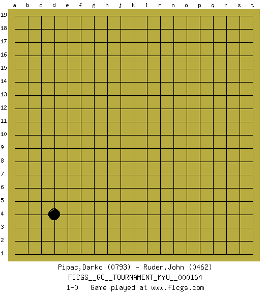 Last move : 1-0 2015 December 29 15:41:52 [Event "FICGS__GO__TOURNAMENT_KYU__000164"] [Site "FICGS"] [Date "2015.11.28"] [Round "1"] [Black "Pipac,Darko"] [White "Ruder,John"] [Result "1-0"] [Rating 1 "0793"] [Rating 2 "0462"] 1.d4 1-0 Here are the names of the openings (joseki) played in the four corners : Corner d4 : d4 1-0 Hoshi (Hwajeom, Seongjeom, Xingwei`) 4-4 Point. The star or hoshi (4-4) point, emphasizing influence at the potential expense of territory. Player Black won this Go (weiqi, baduk) game. Follow this game move after move (download)There is damezumari at the bamboo joint. (Anonymous) O divine art of subtlety and secrecy! Through you we learn to be invisible, through you inaudible and hence we can hold the enemy's fate in our hands. (Sun Tzu)