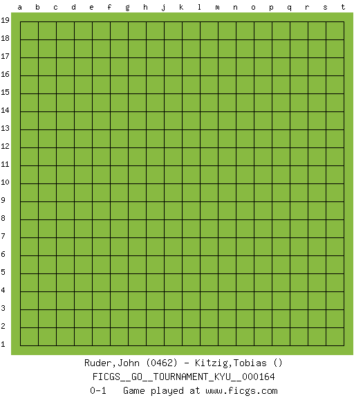 Last move : 0-1 2015 December 28 22:15:28 [Event "FICGS__GO__TOURNAMENT_KYU__000164"] [Site "FICGS"] [Date "2015.11.28"] [Round "1"] [Black "Ruder,John"] [White "Kitzig,Tobias"] [Result "0-1"] [Rating 1 "0462"] 0-1 This go game has been lost on time (started : 2015.11.28 20:12:15) Here are the names of the openings (joseki) played in the four corners : Player White won this Go (weiqi, baduk) game. Follow this game move after move (download)Balance is not what players strike for, and if it does arise, it is in spite of them. (Pierre Audouard) I know the human being and fish can coexist peacefully. (George W. Bush, Saginaw sept. 29, 2000)