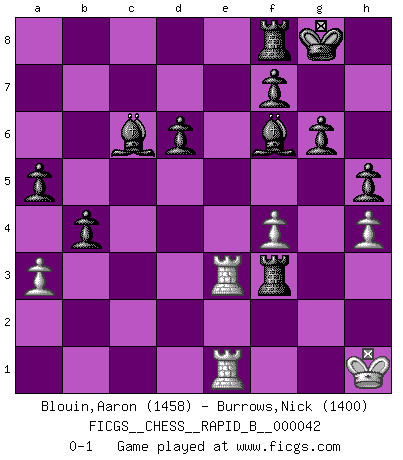 Last move : 0-1 2007 March 29 16:6:47 [Event "FICGS__CHESS__RAPID_B__000042"] [Site "FICGS"] [Date "2007.03.16"] [Round "1"] [White "Blouin,Aaron"] [Black "Burrows,Nick"] [Result "0-1"] [WhiteElo "1458"] [BlackElo "1400"] 1.Nf3 c5 2.e4 d6 3.Bc4 Nf6 4.Nc3 Nc6 5.O-O g6 6.h3 Bg7 7.d4 cxd4 8.Nxd4 O-O 9.Bg5 Qb6 10.Be3 Nxe4 11.Nd5 Qd8 12.Qd3 Nf6 13.Rfe1 Ne5 14.Qb3 Nxc4 15.Qxc4 Bd7 16.Bg5 Rc8 17.Nxe7+ Qxe7 18.Rxe7 Rxc4 19.Nf3 Bc6 20.Bxf6 Bxf6 21.Re3 Rxc2 22.Rae1 Rxb2 23.a3 a5 24.g3 b5 25.h4 h5 26.Nh2 b4 27.f4 Rg2+ 28.Kh1 Rxg3 29.Nf3 Rxf3 0-1 Reti Opening Kingside Castling by player White (move 5) Kingside Castling by player Black (move 8) Player Black won this chess game. Follow this game move after move (download)Examine moves that smite! A good eye for smites is far more important than a knowledge of strategical principles. (Purdy) Karpov ist ein Museumsstück. (Garry Kasparov) Las piezas de Ajedrez son los bloques del alfabeto que moldean los pensamientos; y esos pensamientos, aunque hagan un diseño visual en el tablero, expresan abstractamente su belleza como un poema. (Marcel Duchamp) La tactique, c'est ce que vous faites quand il y a quelque chose à faire; la stratégie, c'est ce que vous faites quand il n'y a rien à faire. (Savielli Tartacower) You cannot beat a roulette table unless you steal money from it. (Albert Einstein)