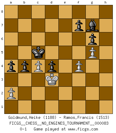 Last move : 0-1 2015 December 14 19:25:28 [Event "FICGS__CHESS__NO_ENGINES_TOURNAMENT__000083"] [Site "FICGS"] [Date "2015.11.29"] [Round "1"] [White "Goldmund,Heike"] [Black "Ramos,Francis"] [Result "0-1"] [WhiteElo "1188"] [BlackElo "1513"] 1.e4 c5 2.c3 d5 3.exd5 Qxd5 4.Qf3 Qxf3 5.Nxf3 Nc6 6.Bb5 Bd7 7.O-O a6 8.Bc4 e6 9.d3 Nf6 10.Be3 Bd6 11.d4 cxd4 12.Nxd4 O-O 13.Nd2 Ne5 14.Bb3 Rfd8 15.N2f3 Rac8 16.Rfd1 Nxf3+ 17.Nxf3 Bc6 18.Nd4 Be7 19.Nxc6 Rxc6 20.Ba4 b5 21.Bb3 Rcd6 22.Rxd6 Bxd6 23.Rd1 Be7 24.Bd4 Nd5 25.Bc2 h5 26.h3 Nf4 27.Be4 e5 28.g3 Ne2+ 29.Kf1 Nxd4 30.cxd4 exd4 31.Bb7 a5 32.f4 Bf6 33.Kf2 b4 34.b3 Rd7 35.Bc6 Rc7 36.Rc1 Kf8 37.Ke2 Ke7 38.Kd3 Kd6 39.Rc4 Rxc6 40.g4 hxg4 41.hxg4 g6 42.g5 Rxc4 43.bxc4 Bg7 44.Kc2 Kc5 45.Kd3 a4 0-1 Sicilian : Alapin's variation (2.c3) Kingside Castling by player White (move 7) Kingside Castling by player Black (move 12) Player Black won this chess game. Follow this game move after move (download)A bad plan is better than none at all. (Frank Marshall) Wenn sie aufgeben, dann danke ich Ihnen für das Spiel (Eventualzug beim Fernschach). (Anonymous) Diferente gente reacciona diferentemente en aceptar la derrota. (Bobby Fischer) Les échecs sont plus proches de l'art de l'assassinat que de l'art de la guerre. (Arturo Perez-Reverte) Whoever said the pen is mightier than the sword obviously never encountered automatic weapons. (US General Douglas MacArthur)