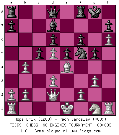 Last move : 1-0 2016 April 9 9:17:52 [Event "FICGS__CHESS__NO_ENGINES_TOURNAMENT__000083"] [Site "FICGS"] [Date "2015.11.29"] [Round "1"] [White "Hops,Erik"] [Black "Pech,Jaroslav"] [Result "1-0"] [WhiteElo "1283"] [BlackElo "0899"] 1.e4 c5 2.Nc3 Nc6 3.g3 g6 4.Bg2 Bg7 5.d3 d6 6.Be3 e5 7.Qd2 Nge7 8.Bh6 O-O 9.h4 Bxh6 10.Qxh6 f6 11.Qd2 Nd4 12.Nd5 Nxd5 13.exd5 Bd7 14.h5 g5 15.c3 Nf5 16.h6 b5 17.Be4 b4 18.cxb4 1-0 This chess game has been lost on time (started : 2015.11.29 12:35:10) Sicilian : Closed, 6.Be3 Kingside Castling by player Black (move 8) Player White won this chess game. Follow this game move after move (download)Mistrust is the most necessary characteristic of the Chess player. (Siegbert Tarrasch) Irgendwie scheint mir sonntags früh um 9 Uhr der Killerinstinkt verloren gegangen zu sein. (Alexej Shirov) La captura del Rey enemigo es la finalidad pero no el primer objetivo de la partida. (William Steinitz) Le jeu d'échecs est comme rejeté hors du temps. (Antoine de Saint-Exupéry) Opportunities multiply as they are seized. (Sun Tzu)