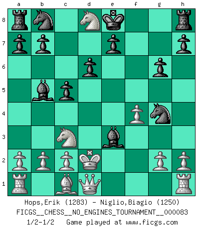 Last move : 1/2-1/2 2015 December 13 14:26:18 [Event "FICGS__CHESS__NO_ENGINES_TOURNAMENT__000083"] [Site "FICGS"] [Date "2015.11.29"] [Round "1"] [White "Hops,Erik"] [Black "Niglio,Biagio"] [Result "1/2-1/2"] [WhiteElo "1283"] [BlackElo "1250"] 1.e4 d6 2.d4 Nf6 3.Nc3 g6 4.f4 Bg7 5.Nf3 c5 6.Bb5+ Bd7 7.e5 Ng4 8.e6 fxe6 9.Ng5 Bxb5 10.Nxe6 Bxd4 11.Nxd8 Bf2+ 12.Kd2 Be3+ 1/2-1/2 Pirc : Austrian attack, Dragon formation This chess game ended in a draw. Follow this game move after move (download)I won't play with you anymore. You have insulted my friend. - When an opponent cursed himself for a blunder. (Miguel Najdorf) Schach ist ein Teil der Kultur, und wenn es mit der Kultur abwärts geht, geht es auch mit dem Schach abwärts. (Mikhail Moiseyevich Botvinik) El Ajedrez es un expediente tonto que hace creer a la gente inactiva que hacen una cosa muy astuta cuando solamente estan perdiendo su tiempo. (George Bernard Shaw) Vous m'avez demandé de vous exposer quel est le fondement de la prière. Je ne fais que préparer les pièces du jeu sur la table... Nous sera-t-il permis d'en adopter les règles et si nous les appliquons scrupuleusement nous ne tarderons pas à faire mat le Roi divin ! Il ne pourra échapper à nos mains. (Sainte Thérèse d'Avila, Chemin de perfection) If passion drives you, let reason holds the reins. (Benjamin Franklin)