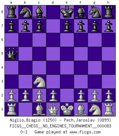 Last move : 0-1 2016 January 19 11:55:47 [Event "FICGS__CHESS__NO_ENGINES_TOURNAMENT__000083"] [Site "FICGS"] [Date "2015.11.29"] [Round "1"] [White "Niglio,Biagio"] [Black "Pech,Jaroslav"] [Result "0-1"] [WhiteElo "1250"] [BlackElo "0899"] 1.e4 d5 2.exd5 Qxd5 3.Nc3 Qa5 0-1 This chess game has been lost on time (started : 2015.11.29 12:35:10) Scandinavian (centre counter) defense Player Black won this chess game. Follow this game move after move (download)Castle early and often. (Rob Sillars) Frage: Wie viele Autos haben Sie schon zerstört? - Antwort: Nur zwei. (Loek van Wely) Repentinamente, me resultaba obvio en mi analisis que yo había pasado por alto lo que Fischer había visto en el tablero con la mas grande facilidad. (Mikhail Botvinnik) Les Echecs sont affaire de jugement sensible. Savoir quand frapper et quand esquiver. (Fischer) Yoga is 99% practice and 1% knowledge. (Sri Krishna Pattabhi Jois)