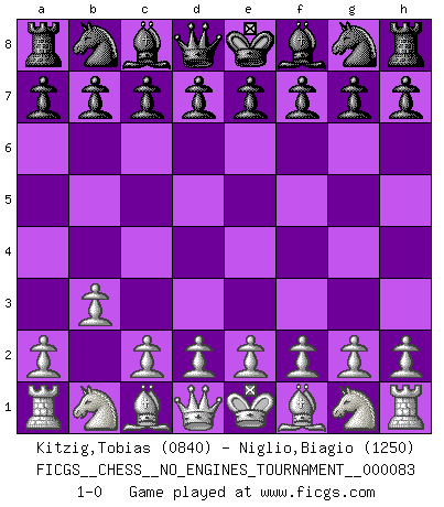 Last move : 1-0 2016 January 22 0:3:7 [Event "FICGS__CHESS__NO_ENGINES_TOURNAMENT__000083"] [Site "FICGS"] [Date "2015.11.29"] [Round "1"] [White "Kitzig,Tobias"] [Black "Niglio,Biagio"] [Result "1-0"] [WhiteElo "0840"] [BlackElo "1250"] 1.b3 1-0 This chess game has been lost on time (started : 2015.11.29 12:35:10) Nimzovich-Larsen attack Player White won this chess game. Follow this game move after move (download)With or without the title, Bobby Fischer was unquestionably the greatest player of his time. (Burt Hochberg) Ich kenne Menschen, die allen Willen der Welt besitzen und doch nicht Schach spielen können. (Robert James Fischer) Una partida de Ajedrez se divide en 3 etapas: la primera cuando piensas que tienes la ventaja, la segunda cuando crees que tienes la ventaja y la tercera... ¡cuando te das cuenta que vas a perder!. (Savielly Tartakower) Toutes les manuvres exécutées sur une colonne ouverte ont pour but ultime l'intrusion définitive sur la septième ou la huitième rangée, en plein cur de la position ennemie. (Aaron Nimzovitch) It is the aim of the modern school, not to treat every position according to one general law, but according to the principle inherent in the position. (Richard Reti)