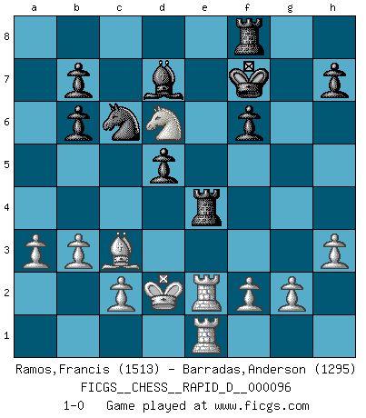 Last move : 1-0 2015 December 6 13:37:45 [Event "FICGS__CHESS__RAPID_D__000096"] [Site "FICGS"] [Date "2015.11.30"] [Round "1"] [White "Ramos,Francis"] [Black "Barradas,Anderson"] [Result "1-0"] [WhiteElo "1513"] [BlackElo "1295"] 1.e4 e5 2.Nf3 Nf6 3.d4 exd4 4.e5 Nd5 5.Qxd4 c6 6.Bc4 Qa5+ 7.Bd2 Qb6 8.Bxd5 cxd5 9.Qxb6 axb6 10.Nc3 Ra5 11.Nd4 Nc6 12.Nb3 Nb4 13.Kd1 Ra6 14.a3 d4 15.Nxd4 Bc5 16.Be3 Bxd4 17.Bxd4 O-O 18.Nb5 Nc6 19.Bc3 f6 20.exf6 gxf6 21.Kd2 d5 22.Rhe1 Ra4 23.b3 Rh4 24.h3 Kf7 25.Re2 Bd7 26.Rae1 Re4 27.Nd6+ 1-0 Petrov : Modern (Steinitz) attack Kingside Castling by player Black (move 17) Player White won this chess game. Follow this game move after move (download)Chess is a forcing house where the fruits of character can ripen more fully than in life. (Edward Morgan Foster) Über Kasparov: Es ist offensichtlich, daß er in einem totalitären Staat aufwuchs und deshalb zu diktatorischen Zügen neigt. (Viktor Kortschnoi) La pasion por jugar al Ajedrez es una de las mas inexplicables en el mundo. (H.G. Wells) Le pion, dans sa simplicité, marche droit devant lui, mais lorsqu'il prend, il le fait obliquement? Ainsi l'homme, tant qu'il reste pauvre, marche dans la droiture et vit honnêtement, mais lorsqu'il recherche les honneurs, il flatte, se parjure et, par les voies obliques, cherche une position supérieure sur l'échiquier du monde. (Jean de Galles) God, you are such an idiot. - Actually, I thought I was more of a jerk. (Gregory House to Stacy Warner, House M.D.)
