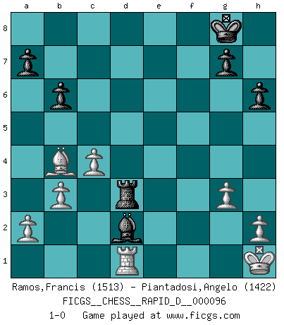 Last move : 1-0 2016 January 23 0:45:47 [Event "FICGS__CHESS__RAPID_D__000096"] [Site "FICGS"] [Date "2015.11.30"] [Round "1"] [White "Ramos,Francis"] [Black "Piantadosi,Angelo"] [Result "1-0"] [WhiteElo "1513"] [BlackElo "1422"] 1.e4 e6 2.d4 d5 3.Nc3 dxe4 4.Nxe4 Nd7 5.Bd3 Ngf6 6.Nf3 Be7 7.O-O O-O 8.Qe2 b6 9.Rd1 Bb7 10.c4 Nxe4 11.Bxe4 Bxe4 12.Qxe4 Nf6 13.Qe2 Qc8 14.Ne5 Qb7 15.Bg5 Rfe8 16.Rac1 h6 17.Bh4 c5 18.b3 Nd7 19.Bg3 Nxe5 20.Bxe5 cxd4 21.Rxd4 Red8 22.Qg4 f6 23.Qxe6+ Kh8 24.Rxd8+ Rxd8 25.Bc3 Bc5 26.Bxf6 Bxf2+ 27.Kh1 Qd7 28.Qxd7 Rxd7 29.Bc3 Kg8 30.g3 Be3 31.Re1 Rd3 32.Bb4 Bd2 33.Rd1 1-0 French : Rubinstein variation Kingside Castling by player White (move 7) Kingside Castling by player Black (move 7) Player White won this chess game. Follow this game move after move (download)Personally, I rather look forward to a computer program winning the world Chess Championship. Humanity needs a lesson in humility. (Richard Dawkings) Ich würde mich als ganz normalen Jungen bezeichnen [Im Alter von 12]. (Sergej Karjakin) El pensamiento metódico es mas útil en el Ajedrez que la inspiración. (C. J. S. Purdy) Les Echecs ont trois composantes : le temps, l'espace et le matériel en dernier. (Mikhail Tal) Luck has a peculiar habit of favoring those who don't depend on it. (Author unknown)