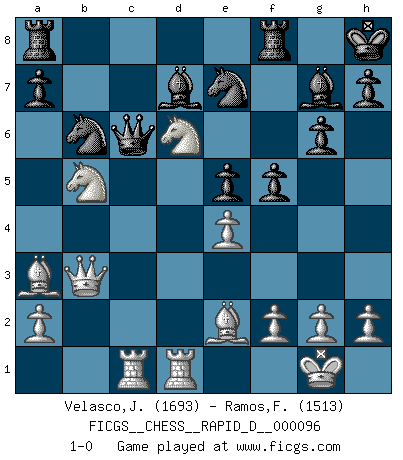 Last move : 1-0 2015 December 6 11:17:45 [Event "FICGS__CHESS__RAPID_D__000096"] [Site "FICGS"] [Date "2015.11.30"] [Round "1"] [White "Velasco,Jose Maria"] [Black "Ramos,Francis"] [Result "1-0"] [WhiteElo "1693"] [BlackElo "1513"] 1.d4 Nf6 2.c4 g6 3.Nc3 Bg7 4.e4 d6 5.Nf3 O-O 6.Be2 e5 7.O-O Nc6 8.d5 Ne7 9.b4 Nd7 10.Nd2 f5 11.c5 dxc5 12.bxc5 Nxc5 13.Ba3 Nd7 14.Nc4 Nb6 15.Qb3 Kh8 16.Nb5 Re8 17.d6 cxd6 18.Ncxd6 Rf8 19.Rfd1 Bd7 20.Nxb7 Qc8 21.N7d6 Qc6 22.Rac1 1-0 King's Indian : Orthodox, Aronin-Taimanov variation (Yugoslav attack / Mar del Plata variation) Kingside Castling by player Black (move 5) Kingside Castling by player White (move 7) Player White won this chess game. Follow this game move after move (download)Checkers is for tramps. (Paul Morphy) Ohne ihre Erfolge schmälern zu wollen würde ich sagen Petrosian, Spassky und Karpov verdanken ihre Siege ihren Trainern - Boleslavsky, Bondarevsky und Furman. (Mikhail Moiseyevich Botvinik) En el Ajedrez, cuando menos, el valiente hereda la tierra. (Edmar Mednis) Psychologiquement, tu dois avoir confiance en toi même, mais cette confiance doit être basée sur des faits. (Robert Fischer) Only sick music makes money today. (Friedrich Nietzsche)