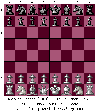 Last move : 0-1 2007 April 15 23:10:44 [Event "FICGS__CHESS__RAPID_B__000042"] [Site "FICGS"] [Date "2007.03.16"] [Round "1"] [White "Shearer,Joseph"] [Black "Blouin,Aaron"] [Result "0-1"] [WhiteElo "1400"] [BlackElo "1458"] 0-1 This chess game has been lost on time (started : 2007.03.16 20:49:37) Player Black won this chess game. Follow this game move after move (download)Your body has to be in top condition. Your Chess deteriorates as your body does. You can't separate body from mind. (Bobby Fischer) In der Schule lernt man nichts. Es ist nur Zeitverschwendung. (Robert James Fischer) Nos gusta pensar. (Gary Kasparov) Toutes choses étant égales, c'est la conviction qui gagne. Alliée à une volonté de vaincre, elle sert de détonateur, suscite des idées, disperse les doutes et aide à penser clairement. (Robert Fischer) Beep ! (R2D2 in Star Wars ep.3)