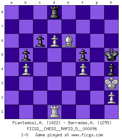 Last move : 1-0 2016 January 24 1:20:14 [Event "FICGS__CHESS__RAPID_D__000096"] [Site "FICGS"] [Date "2015.11.30"] [Round "1"] [White "Piantadosi,Angelo"] [Black "Barradas,Anderson"] [Result "1-0"] [WhiteElo "1422"] [BlackElo "1295"] 1.d4 d5 2.c4 c6 3.cxd5 Qa5+ 4.Bd2 Qxd5 5.Nf3 Nf6 6.Nc3 Qd6 7.e4 Bg4 8.Be2 Bxf3 9.Bxf3 e5 10.dxe5 Qxe5 11.O-O Bd6 12.g3 O-O 13.Bf4 Qe6 14.Qxd6 Qxd6 15.Bxd6 Rd8 16.e5 Ne8 17.Rad1 Nxd6 18.Rxd6 Rxd6 19.exd6 Nd7 20.Re1 Rd8 21.Bg4 Nf6 22.Bf3 g6 23.Rd1 Rd7 24.Ne4 Nxe4 25.Bxe4 Kg7 26.f4 f5 27.Bc2 b5 28.a4 a6 29.axb5 axb5 30.b4 Kf6 31.Kf2 h6 32.Bb3 g5 33.Ke3 gxf4+ 34.gxf4 h5 35.Kf3 h4 36.Ba2 Rd8 37.Kg2 Kg6 38.Kh3 Kh5 39.Be6 1-0 QGD Slav defense : Exchange variation Kingside Castling by player White (move 11) Kingside Castling by player Black (move 12) Player White won this chess game. Follow this game move after move (download)If I win a tournament, I win it by myself. I do the playing. Nobody helps me. (Bobby Fischer) Kein Großmeister ist normal. Sie unterscheiden sich nur im Ausmaß Ihrer Verrücktheit. (Viktor Kortschnoi) Me dio la sensación de como si yo estuviera jugando en contra del mismo Ajedrez. - al estar jugando en contra de Robert Fischer (Walter Shipman) Je crois qu'il existe des manières très spécifiques de jouer efficacement contre une machine. Evidemment, nous n'avons aucune chance en technique pure, parce que l'ordinateur calcule de manière parfaite. Mais lorsque nous faisons appel à notre cerveau, en utilisant l'intuition et la compréhension, alors nous restons beaucoup plus forts. (Anatoli Karpov) A clear conscience is usually the sign of a bad memory. (Unknown)