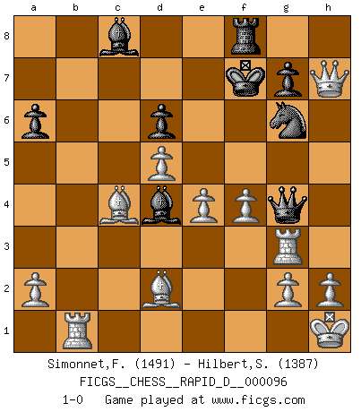 Last move : 1-0 2015 December 26 14:45:22 [Event "FICGS__CHESS__RAPID_D__000096"] [Site "FICGS"] [Date "2015.11.30"] [Round "1"] [White "Simonnet,Franck"] [Black "Hilbert,Stephan J."] [Result "1-0"] [WhiteElo "1491"] [BlackElo "1387"] 1.d4 Nf6 2.Nf3 e6 3.e3 b6 4.c4 Bb7 5.Nc3 c5 6.d5 d6 7.dxe6 fxe6 8.Bd3 Nbd7 9.O-O Be7 10.Ng5 O-O 11.Nxe6 Qc8 12.Nxf8 Nxf8 13.Nd5 Nxd5 14.cxd5 Qe8 15.e4 Ng6 16.Qh5 Qd7 17.f4 Rf8 18.Bd2 Bf6 19.Rab1 b5 20.b3 a6 21.Rf3 c4 22.bxc4 Bd4+ 23.Kh1 bxc4 24.Bxc4 Bc8 25.Rh3 Qg4 26.Qxh7+ Kf7 27.Rg3 1-0 Queen's pawn : Yusupov-Rubinstein system Kingside Castling by player White (move 9) Kingside Castling by player Black (move 10) Player White won this chess game. Follow this game move after move (download)If I win a tournament, I win it by myself. I do the playing. Nobody helps me. (Bobby Fischer) Ich spiele 70 Eröffnungssysteme. (Viktor Kortschnoi) ¿Esta Bobby Fischer algo cuerdo?. (Salo Flohr) Tout change constamment, y compris dans le monde des Echecs. (Botvinnik) The general who wins the battle makes many calculations in his temple before the battle is fought. The general who loses makes but few calculations beforehand. (Sun Tzu)
