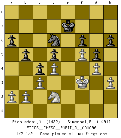Last move : 1/2-1/2 2016 March 8 23:13:55 [Event "FICGS__CHESS__RAPID_D__000096"] [Site "FICGS"] [Date "2015.11.30"] [Round "1"] [White "Piantadosi,Angelo"] [Black "Simonnet,Franck"] [Result "1/2-1/2"] [WhiteElo "1422"] [BlackElo "1491"] 1.e4 d6 2.d4 Nf6 3.Nc3 g6 4.Nf3 Bg7 5.h3 O-O 6.Bc4 c5 7.O-O a6 8.Be3 b5 9.Bd3 c4 10.Be2 Bb7 11.e5 Ne4 12.Nxe4 Bxe4 13.c3 Nc6 14.exd6 Qxd6 15.Nd2 Bd5 16.Bf3 e6 17.Bxd5 exd5 18.Qf3 Ne7 19.Bf4 Qb6 20.Rfe1 Rfe8 21.Be5 Qd8 22.Bxg7 Kxg7 23.Qe3 Nf5 24.Qxe8 Qxe8 25.Rxe8 Rxe8 26.Kf1 Nd6 27.Re1 f6 28.Rxe8 Nxe8 29.Ke2 Kf7 30.Kf3 Nd6 31.g4 Ke6 32.Ke3 Nf7 33.f4 Nd6 34.Kf3 Ke7 35.Ke3 Ke6 36.Kf3 h6 37.Ke3 g5 38.f5+ Ke7 39.Kf3 1/2-1/2 Pirc : Classical, h3 system Kingside Castling by player Black (move 5) Kingside Castling by player White (move 7) This chess game ended in a draw. Follow this game move after move (download)In a gambit you give up a Pawn for the sake of getting a lost game. (Samuel Standige Boden) Es ist wirklich schade, dass so viele Schachspieler nicht auf ihr Äußeres achten! (Alexandra Kosteniuk) ¿Quién es tu oponente esta tarde? Esta tarde mi oponente son las piezas negras. (Akiba Rubinstein) Aux échecs, les retours au sommet sont rares : les dommages psychologiques consécutifs à une défaite sont trop sévères. (Daily Telegraph) Internal peace cannot coexist with external war. (Don Groves)
