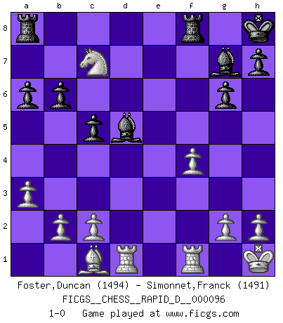 Last move : 1-0 2016 January 10 21:24:26 [Event "FICGS__CHESS__RAPID_D__000096"] [Site "FICGS"] [Date "2015.11.30"] [Round "1"] [White "Foster,Duncan"] [Black "Simonnet,Franck"] [Result "1-0"] [WhiteElo "1494"] [BlackElo "1491"] 1.e4 d6 2.d4 Nf6 3.Nc3 g6 4.f4 Bg7 5.a3 O-O 6.Nf3 c5 7.dxc5 dxc5 8.Be3 b6 9.Bd3 Bb7 10.Qe2 Ng4 11.e5 e6 12.Bd2 Nc6 13.O-O f6 14.exf6 Nd4 15.Nxd4 Qxd4+ 16.Kh1 Nxf6 17.Qxe6+ Kh8 18.Be3 Qd7 19.Qxd7 Nxd7 20.Rad1 Nf6 21.Nb5 Nd5 22.Bc1 Bc6 23.Bc4 a6 24.Bxd5 Bxd5 25.Nc7 1-0 Pirc : Austrian attack Kingside Castling by player Black (move 5) Kingside Castling by player White (move 13) Player White won this chess game. Follow this game move after move (download)There is no remorse like the remorse of Chess. (H. G. Wells) Du kannst im Schach nur gut werden, wenn du das Spiel liebst. (Robert James Fischer) Bobby Fischer es el jugador de Ajedrez mas grande que jamás haya existido. (Ken Smith) Il n'y a pas de prix trop élevé au scalp de l'ennemi. (Koblentz) God, you are such an idiot. - Actually, I thought I was more of a jerk. (Gregory House to Stacy Warner, House M.D.)