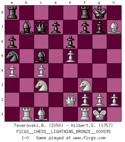 Last move : 1-0 2015 November 30 15:23:3 [Event "FICGS__CHESS__LIGHTNING_BRONZE__000595"] [Site "FICGS"] [Date "2015.11.30"] [Round "1"] [White "Teverovski,Bogoljub"] [Black "Hilbert,Stephan J."] [Result "1-0"] [WhiteElo "2050"] [BlackElo "1757"] 1.d4 b5 2.e4 Bb7 3.Nd2 Nf6 4.e5 Nd5 5.Ngf3 a6 6.a4 b4 7.c4 bxc3 8.bxc3 Nc6 9.Ne4 e6 10.Bd3 Na5 11.O-O Be7 12.Rb1 O-O 13.Qe2 c5 14.dxc5 Qc7 15.c4 Nc3 16.Nxc3 Bxc5 17.Bxh7+ 1-0 Polish defense Kingside Castling by player White (move 11) Kingside Castling by player Black (move 12) Player White won this chess game. Follow this game move after move (download)Don't even mention losing to me. I can't stand to think of it. (Bobby Fischer) Ich habe kein Problem mit Frauen, sondern nur mit dem Niveau ihres Schachspiels (Judith Polgar) El Ajedrez es una guerra en un tablero. El objetivo es aplastar la mente del oponente. (Bobby Fischer) Donnez-moi un Cavalier en 6e et je gagnerais toutes mes parties. (Steinitz) Gambling : The sure way of getting nothing from something. (Wilson Mizner)