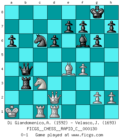 Last move : 0-1 2016 January 16 23:24:45 [Event "FICGS__CHESS__RAPID_C__000130"] [Site "FICGS"] [Date "2015.12.04"] [Round "1"] [White "Di Giandomenico,Alfonso"] [Black "Velasco,Jose Maria"] [Result "0-1"] [WhiteElo "1592"] [BlackElo "1693"] 1.e4 c5 2.Nf3 d6 3.d4 cxd4 4.Nxd4 Nf6 5.Nc3 a6 6.Bd3 g6 7.f3 Bg7 8.Nde2 Nc6 9.Be3 O-O 10.Qd2 b5 11.O-O-O Qa5 12.Kb1 b4 13.Nd5 Nxd5 14.exd5 Qxd5 15.Bh6 Be6 16.b3 Bf6 17.Bxf8 Qe5 18.c3 Rxf8 19.f4 Qc5 20.Rc1 bxc3 21.Nxc3 Qd4 22.Rhd1 Rb8 23.Be4 Bxb3 24.axb3 Rxb3+ 25.Ka1 Qb4 0-1 Sicilian : Najdorf Kingside Castling by player Black (move 9) Queenside Castling by player White (move 11) Player Black won this chess game. Follow this game move after move (download)The defensive power of a pinned piece is only imaginary. (Aaron Nimzovich) Garry Kasparov war erst in der Großmeister-Organisation GMA, dann in der Profischach-Vereinigung PCA, zum Schluss kehrte er wieder in den Schoß der FIDE zurück. Aber gut, manche Leute sind flexibel (Viswanathan Anand) El Rey es una pieza de pelea. ¡Usenlo!. (Wilhelm Steinitz) Je ne suis pas le dernier à jouer lâchement des coups douteux pendant le zeïtnot de l'adversaire pour l'achever: en effet les coups qui font le plus peur sont ceux que l'on ne comprend pas. Je me fais souvent peur quand je joue. (Un professeur anonyme) Life is like a ten-speed bicycle: most of us have gears we never use. (Charles M. Schulz)