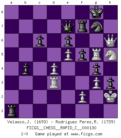 Last move : 1-0 2015 December 24 23:7:43 [Event "FICGS__CHESS__RAPID_C__000130"] [Site "FICGS"] [Date "2015.12.04"] [Round "1"] [White "Velasco,Jose Maria"] [Black "Rodriguez Perez,Rene"] [Result "1-0"] [WhiteElo "1693"] [BlackElo "1739"] 1.d4 e6 2.c4 d5 3.Nf3 c6 4.Nc3 Nf6 5.Bg5 h6 6.Bh4 dxc4 7.e4 g5 8.Bg3 b5 9.Be2 Bb7 10.h4 g4 11.Ne5 h5 12.O-O Nbd7 13.Qc2 Nxe5 14.Bxe5 Bg7 15.b3 cxb3 16.axb3 O-O 17.Rad1 Qe7 18.Bd3 a5 19.Qc1 a4 20.bxa4 b4 21.Ne2 Ne8 22.Bxg7 Nxg7 23.Qh6 Ba6 24.Nf4 Bxd3 25.Rxd3 Qxh4 26.g3 Qe7 27.Rc1 Rxa4 28.Rc5 Ra1+ 29.Kg2 h4 30.Rg5 h3+ 31.Kh2 f5 32.Nh5 Rf7 33.e5 1-0 Queen's pawn Kingside Castling by player White (move 12) Kingside Castling by player Black (move 16) Player White won this chess game. Follow this game move after move (download)When you see a good move, look for a better one. (Emanuel Lasker) Es gibt zwei Arten von Opfern: Korrekte und meine. (Mikhail Nekhemyevich Tal) El Ajedrez es parte de la cultura, y si una cultura esta en decadencia, entonces también el Ajedrez declinará. (Mikhail Botvinnik) On est toujours la mazette de quelqu'un d'autre. (Anonyme) The only sure thing about luck is that it will change. (Wilson Mizner)
