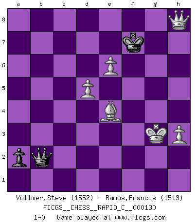 Last move : 1-0 2015 December 25 1:15:22 [Event "FICGS__CHESS__RAPID_C__000130"] [Site "FICGS"] [Date "2015.12.04"] [Round "1"] [White "Vollmer,Steve"] [Black "Ramos,Francis"] [Result "1-0"] [WhiteElo "1552"] [BlackElo "1513"] 1.Nf3 Nf6 2.g3 g6 3.Bg2 Bg7 4.c4 d6 5.d4 O-O 6.Nc3 Nbd7 7.e4 c5 8.d5 a6 9.O-O Re8 10.a4 Nf8 11.Qc2 e6 12.Bg5 h6 13.Bd2 exd5 14.cxd5 Bg4 15.Rfe1 N6d7 16.h3 Bxf3 17.Bxf3 Ne5 18.Bg2 Qd7 19.b3 g5 20.f4 gxf4 21.gxf4 Neg6 22.Kh2 b5 23.Rad1 b4 24.Ne2 Kh8 25.Ng3 Nh4 26.Bh1 Nfg6 27.Nh5 Rg8 28.Nxg7 Rxg7 29.Rg1 Rag8 30.Bc1 f6 31.Qf2 Qe7 32.Rg4 Kh7 33.f5 h5 34.fxg6+ Nxg6 35.R4g1 Qe5+ 36.Qg3 Qe7 37.Bf4 Ne5 38.Qe3 c4 39.Qe2 Qf7 40.Rxg7+ Rxg7 41.bxc4 h4 42.Bxe5 fxe5 43.Rf1 Qg6 44.Qf3 b3 45.Qxb3 Qe8 46.Qf3 Qxa4 47.Qf5+ Kh8 48.Qf2 Qxc4 49.Rg1 Rxg1 50.Qxg1 a5 51.Qf2 a4 52.Qxh4+ Kg8 53.Qg3+ Kf7 54.Qa3 Qb3 55.Qxd6 a3 56.Qe6+ Kg7 57.Qxe5+ Kh6 58.Qh8+ Kg6 59.e5 Qb2+ 60.Kg3 a2 61.Be4+ Kf7 62.e6+ 1-0 Reti : King's Indian attack Kingside Castling by player Black (move 5) Kingside Castling by player White (move 9) 10 pieces endgame at move 55 : White KQBPPP , Black KQPP WHITE : King + 1 Queen 1 Bishop 3 Pawns BLACK : King + 1 Queen 2 Pawns 9 pieces endgame at move 57 : White KQBPPP , Black KQP WHITE : King + 1 Queen 1 Bishop 3 Pawns BLACK : King + 1 Queen 1 Pawn Player White won this chess game. Follow this game move after move (download)Whoever sees no other aim in the game than that of giving checkmate to one's opponent will never become a good Chess player. (Euwe) Ich spiele ehrlich und spiele, um zu gewinnen. Wenn ich verliere nehme ich meine Medizin. (Robert James Fischer) Con o sin el título, Bobby Fischer fue sin lugar a dudas el mas grande jugador de su época. (Burt Hochberg) Le moment que je préfère le plus dans une rencontre, c'est celui où je sens que la personnalité de l'adversaire se brise. (Robert Fischer) Knowledge will give you power, but character respect. (Bruce Lee)