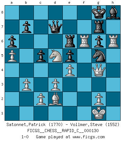 Last move : 1-0 2016 January 30 12:17:5 [Event "FICGS__CHESS__RAPID_C__000130"] [Site "FICGS"] [Date "2015.12.04"] [Round "1"] [White "Satonnet,Patrick"] [Black "Vollmer,Steve"] [Result "1-0"] [WhiteElo "1770"] [BlackElo "1552"] 1.e4 c5 2.f4 Nc6 3.Nf3 d6 4.Bb5 Nf6 5.Nc3 g6 6.O-O Bg7 7.d3 O-O 8.Bd2 Bd7 9.a4 Qc7 10.Bxc6 Bxc6 11.Qe2 e5 12.Rae1 a6 13.fxe5 dxe5 14.b3 Rae8 15.Nd1 Bd7 16.Ne3 Be6 17.Ng5 Qd7 18.Nxe6 Rxe6 19.a5 Qc7 20.Rf3 Ne8 21.Ref1 f6 22.h4 Nd6 23.h5 Nf7 24.hxg6 hxg6 25.Rh3 Ng5 26.Rh2 Qd7 27.Qg4 Bh8 28.Nd5 Rf7 29.Rh6 Rg7 30.Rxf6 1-0 Sicilian : Grand Prix attack Kingside Castling by player White (move 6) Kingside Castling by player Black (move 7) Player White won this chess game. Follow this game move after move (download)One bad move nullifies forty good ones. (Horowitz) Kein Schachspieler kann gut schlafen. (H. G. Wells) La esencia del Ajedrez es pensar acerca de lo que el Ajedrez es. (David Bronstein) La tactique, c'est ce que vous faites quand il y a quelque chose à faire; la stratégie, c'est ce que vous faites quand il n'y a rien à faire. (Savielli Tartacower) Thibault, I ask for draw. Game 13876. - Sorry Ilmars, you won. (FICGS chat)