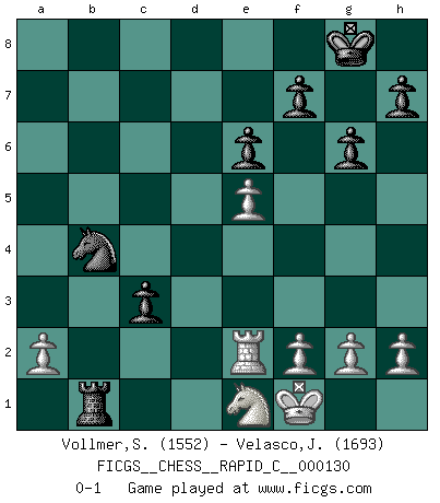 Last move : 0-1 2016 January 2 17:40:25 [Event "FICGS__CHESS__RAPID_C__000130"] [Site "FICGS"] [Date "2015.12.04"] [Round "1"] [White "Vollmer,Steve"] [Black "Velasco,Jose Maria"] [Result "0-1"] [WhiteElo "1552"] [BlackElo "1693"] 1.d4 Nf6 2.c4 e6 3.Nf3 d5 4.Nc3 c6 5.e3 Nbd7 6.Bd3 dxc4 7.Bxc4 b5 8.Bd3 Bb7 9.O-O a6 10.e4 c5 11.d5 Qc7 12.e5 Nxd5 13.Nxd5 Bxd5 14.Re1 c4 15.Be4 Bxe4 16.Rxe4 Nc5 17.Re2 Be7 18.Qc2 Nd3 19.b3 O-O 20.bxc4 bxc4 21.Bd2 Rfd8 22.Bc3 Rac8 23.Rb1 Rd5 24.Qa4 a5 25.Rb5 Rxb5 26.Qxb5 Rb8 27.Qa4 Rb1+ 28.Ne1 g6 29.Qxa5 Qxa5 30.Bxa5 Bb4 31.Bxb4 Nxb4 32.Kf1 c3 0-1 Queen's pawn game Kingside Castling by player White (move 9) Kingside Castling by player Black (move 19) Player Black won this chess game. Follow this game move after move (download)Nowadays, when you're not a grandmaster at 14, you can forget about it. (Anand Viswanathan) Wenn Spassky eine Figur opfert kannst du genauso gut aufgeben. Aber wenn Tal eine Figur opfert, spiel weiter. Er könnte noch eine weitere opfern, und dann ... wer weiß? (Miguel Najdorf) Yo tuve un dolor de muelas en la primer partida. En el segundo juego, tuve un dolor de cabeza. En el tercero, tuve un ataque de reumatísmo. En la cuarta partida, no me sentía muy bien. ¿Y en el quinto juego? Bueno, ¿que acaso uno tiene que ganar todos los juegos?. (Siegbert Tarrasch) Toutes choses étant égales, c'est la conviction qui gagne. Alliée à une volonté de vaincre, elle sert de détonateur, suscite des idées, disperse les doutes et aide à penser clairement. (Robert Fischer) There is a great deal of difference between an eager man who wants to read a book and a tired man who wants a book to read. (G.K. Chesterton)