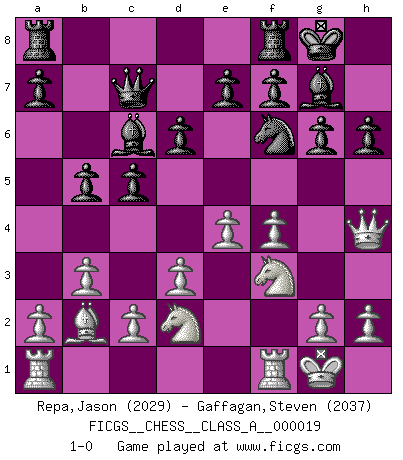 Last move : 1-0 2007 July 14 23:0:55 [Event "FICGS__CHESS__CLASS_A__000019"] [Site "FICGS"] [Date "2007.03.19"] [Round "1"] [White "Repa,Jason"] [Black "Gaffagan,Steven"] [Result "1-0"] [WhiteElo "2029"] [BlackElo "2037"] 1.f4 Nf6 2.Nf3 g6 3.b3 Bg7 4.Bb2 O-O 5.e3 d6 6.Be2 c5 7.O-O Nc6 8.Bb5 Bd7 9.d3 Qb6 10.Bxc6 Bxc6 11.Nbd2 Qc7 12.Qe1 b5 13.Qh4 h6 14.e4 1-0 This chess game has been lost on time (started : 2007.03.19 18:55:57) Bird's Opening Kingside Castling by player Black (move 4) Kingside Castling by player White (move 7) Player White won this chess game. Follow this game move after move (download)Chess is like life. (Boris Spassky) Nach Morphy wurde nichts neues mehr in der Behandlung offener Positionen gefunden. (Mikhail Moiseyevich Botvinik) Me siento como si fuera una pieza en una partida de Ajedrez, cuando mi oponente me indica: esa pieza no puede ser movida. (Soren Kierkegaard) Nous sommes les pions de la mystérieuse partie d'Echecs jouée par Dieu. Il nous déplace, nous arrête, nous pousse encore, puis nous lance un à un dans la boîte du Néant. Epitaphe sur la tombe de David Janowsky (1868-1927). I don't diet. I just don't eat as much as I'd like to. (Linda Evangelista, supermodel)