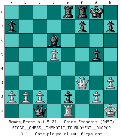 Last move : 0-1 2015 December 21 15:59:45 [Event "FICGS__CHESS__THEMATIC_TOURNAMENT__000202"] [Site "FICGS"] [Date "2015.12.04"] [Round "1"] [White "Ramos,Francis"] [Black "Caire,Francois"] [Result "0-1"] [WhiteElo "1513"] [BlackElo "2457"] 1.e4 e5 2.f4 exf4 3.Bc4 Nf6 4.Nc3 c6 5.Nf3 d5 6.exd5 cxd5 7.Bb5+ Nc6 8.O-O Bd6 9.d3 O-O 10.d4 Bg4 11.Bxc6 bxc6 12.Qd3 Ne4 13.Nxe4 Bf5 14.Qc3 dxe4 15.Ne5 g5 16.Nxc6 Qf6 17.d5 Qh6 18.Nd4 Bg4 19.h3 Rae8 20.Qd2 e3 21.Qd3 e2 22.Re1 Qh4 23.Bd2 f3 24.Nxf3 Bxf3 25.Qxf3 Qd4+ 26.Kh1 Qxd2 27.Rac1 Qxc1 0-1 KGA : Bishop's gambit, Jaenisch variation Kingside Castling by player White (move 8) Kingside Castling by player Black (move 9) Player Black won this chess game. Follow this game move after move (download)The chessboard is the world, the pieces are the phenomena of the Universe, the rules of the game are what we call the laws of Nature and the player on the other side is hidden from us. (Thomas Huxley) Es ist schade, dass viele Schachsportler vergessen, wie wichtig Auftreten und angemessene Kleidung sind. (Alexandra Kosteniuk) Coloca el contenido del tablero de Ajedrez en un sombrero, agita las piezas vigorosamente, derrámalas en el tablero desde una altura de medio metro y así obtienes el estilo de Wilhelm Steinitz. (H. E. Bird) A ce moment-là, je menaçais de comprendre la position ! (Clément L'Heureux) If passion drives you, let reason holds the reins. (Benjamin Franklin)