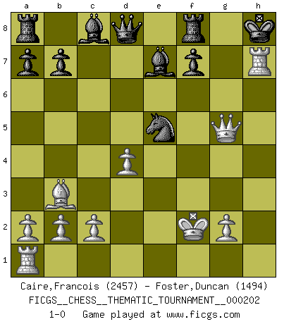 Last move : 1-0 2016 February 28 13:50:46 [Event "FICGS__CHESS__THEMATIC_TOURNAMENT__000202"] [Site "FICGS"] [Date "2015.12.04"] [Round "1"] [White "Caire,Francois"] [Black "Foster,Duncan"] [Result "1-0"] [WhiteElo "2457"] [BlackElo "1494"] 1.e4 e5 2.f4 exf4 3.Bc4 c6 4.Nc3 Nf6 5.Bb3 d5 6.exd5 cxd5 7.d4 Bb4 8.Nge2 O-O 9.O-O g5 10.h4 h6 11.hxg5 hxg5 12.Nxf4 gxf4 13.Bxf4 Nc6 14.Nxd5 Nxd5 15.Qh5 Nf6 16.Qg5+ Kh8 17.Be5 Be7 18.Kf2 Nxe5 19.Rh1+ Nh7 20.Rxh7+ 1-0 KGA : Bishop's gambit, Ruy Lopez defense Kingside Castling by player Black (move 8) Kingside Castling by player White (move 9) Player White won this chess game. Follow this game move after move (download)The combination player thinks forward; he starts from the given position, and tries the forceful moves in his mind. (Emanuel Lasker) Ich las kürzlich ein Buch von Nietzsche. Er sagte Religion verdumme nur die Menschen. Ich stimme zu. (Robert James Fischer) Cuando tu no sabes absolutamente que mas hacer, es tiempo de entrar en pánico. (John van der Wiel) Les échecs sont utiles à l'exercice de la faculté de penser et à celle de l'imagination. Car nous devons posséder une méthode élaborée pour atteindre des buts partout où nous devons conduire notre raison. (Leibnitz) A generalist learns less and less about more and more until he knows nothing about everything. (Author unknown)