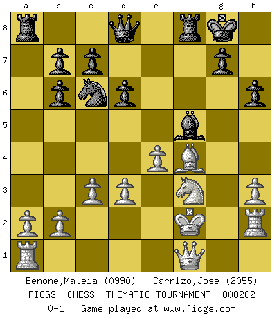 Last move : 0-1 2016 March 5 5:39:5 [Event "FICGS__CHESS__THEMATIC_TOURNAMENT__000202"] [Site "FICGS"] [Date "2015.12.04"] [Round "1"] [White "Benone,Mateia"] [Black "Carrizo,Jose"] [Result "0-1"] [WhiteElo "0990"] [BlackElo "2055"] 1.e4 e5 2.f4 Bc5 3.Nf3 d6 4.d3 Nf6 5.h3 Nh5 6.Nc3 Ng3 7.Rh2 Nc6 8.Na4 Bb6 9.Nxb6 axb6 10.Kf2 Nxf1 11.Qxf1 exf4 12.Bxf4 O-O 13.c3 h6 14.g4 f5 15.gxf5 Bxf5 0-1 This chess game has been lost on time (started : 2015.12.04 14:30:44) KGD : Classical variation Kingside Castling by player Black (move 12) Player Black won this chess game. Follow this game move after move (download)Chess is a terrific way for kids to build self image and self esteem. (Saudin Robovic) Stelle das Brett so, daß die Sonne in die Augen deines Gegners scheint. (Ruy López) Aquel que toma al Peón de Caballo de la Reina, se pasará la noche a dormir en la calle. (Anónimo) D'abord les bases : Jouez et étudiez, puis étudiez et jouez, ensuite jouez et étudiez, puis étudiez et jouez. Deuxièmement : Donnez toujours le meilleur de vous-même ! (Ken Smith) Don't be irreplaceable, if you can't be replaced, you can't be promoted. (Dan Rotaru)