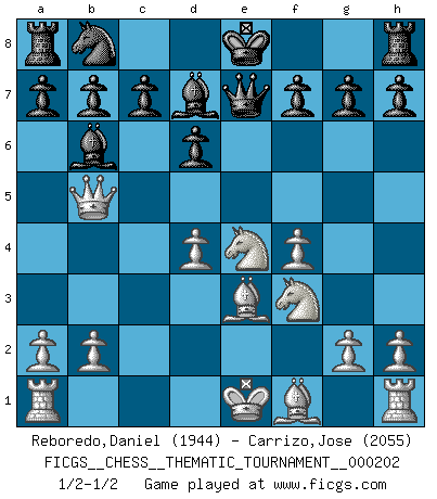 Last move : 1/2-1/2 2015 December 15 19:19:39 [Event "FICGS__CHESS__THEMATIC_TOURNAMENT__000202"] [Site "FICGS"] [Date "2015.12.04"] [Round "1"] [White "Reboredo,Daniel"] [Black "Carrizo,Jose"] [Result "1/2-1/2"] [WhiteElo "1944"] [BlackElo "2055"] 1.e4 e5 2.f4 Bc5 3.Nf3 d6 4.c3 Bb6 5.d4 exd4 6.cxd4 Bg4 7.Be3 Nf6 8.Nc3 Nxe4 9.Nxe4 Qe7 10.Qd3 Bf5 11.Qb5+ Bd7 12.Qd3 Bf5 13.Qb5+ Bd7 1/2-1/2 KGD : Classical, 4.c3 This chess game ended in a draw. Follow this game move after move (download)With or without the title, Bobby Fischer was unquestionably the greatest player of his time. (Burt Hochberg) Heutzutage gewinnt im Turnier nicht derjenige Spieler, der weitreichende Pläne entwirft, sondern einfach jener, der Zug um Zug kämpft. (David Bronstein) Ciertamente el estado mental actual de Bobby Fischer es una tragedia. Uno de los mas grandes jugadores de Ajedrez del mundo -el orgullo y pena del Ajedrez Americano. (Frank Brady) La tactique, c'est ce que vous faites quand il y a quelque chose à faire; la stratégie, c'est ce que vous faites quand il n'y a rien à faire. (Savielli Tartacower) Your best chance to get a Royal Flush in a casino is in the bathroom. (Anonymous)