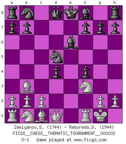 Last move : 0-1 2016 February 24 16:13:22 [Event "FICGS__CHESS__THEMATIC_TOURNAMENT__000202"] [Site "FICGS"] [Date "2015.12.04"] [Round "1"] [White "Zemlyanov,Sergey"] [Black "Reboredo,Daniel"] [Result "0-1"] [WhiteElo "1744"] [BlackElo "1944"] 1.e4 e5 2.f4 d5 3.exd5 exf4 4.Nf3 Nf6 5.Bc4 Nxd5 6.O-O Be6 7.Bb3 c5 8.d4 cxd4 0-1 This chess game has been lost on time (started : 2015.12.04 14:30:44) KGD : Falkbeer counter-gambit Kingside Castling by player White (move 6) Player Black won this chess game. Follow this game move after move (download)I'd rather have a Pawn than a finger. (Reuben Fine) Dieses schreckliche Gefühl, dass ich gegen eine Maschine spielte, die niemals Fehler macht, zerschmetterte meinen Widerstand. (Mark Taimanov) No hay otro maestro que tenga una voluntad terrífica de ganar. Al tablero, el irradía peligro y aún los oponentes mas fuertes tienden a congelarse como liebres cuando olfatean a una pantera. Aún sus debilidades son peligrosas. Con las blancas, su juego de apertura es predecible - te es posible hacer planes en su contra - pero es tan fuerte que tus planes casi nunca funcionan. En el juego medio, su precisión e invención son fabulosas y en finales, tú simplemente no le puedes vencer. (Experto Alemán anónimo) Je menace de comprendre la position. (Anonyme) Secret operations are essential in war; upon them the army relies to make its every move. (Sun Tzu)