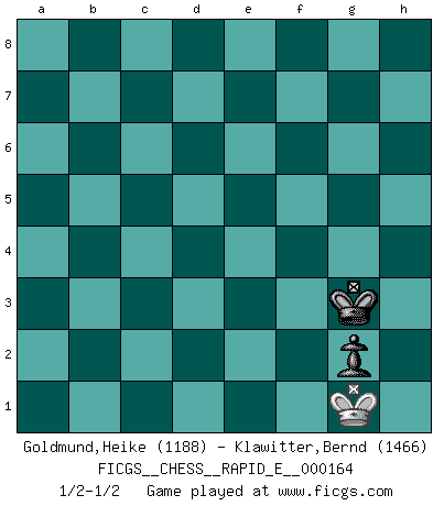 Last move : 1/2-1/2 2016 February 18 17:2:35 [Event "FICGS__CHESS__RAPID_E__000164"] [Site "FICGS"] [Date "2015.12.04"] [Round "1"] [White "Goldmund,Heike"] [Black "Klawitter,Bernd"] [Result "1/2-1/2"] [WhiteElo "1188"] [BlackElo "1466"] 1.b4 e6 2.Bb2 Nf6 3.a3 Be7 4.e3 c6 5.c4 d6 6.Nf3 e5 7.Be2 h6 8.O-O Bf5 9.d3 O-O 10.e4 Bh7 11.Nbd2 Nbd7 12.Qc2 a6 13.Nb3 Re8 14.c5 dxc5 15.Nxc5 Nxc5 16.bxc5 Nd7 17.Qc3 f6 18.Nh4 Bxc5 19.Bg4 Bd4 20.Qc4+ Kh8 21.Bxd4 exd4 22.Qf7 Ne5 23.Qh5 Nxg4 24.h3 Ne5 25.Rfd1 Qe7 26.f4 Nxd3 27.Rxd3 Qxe4 28.Rad1 Qxf4 29.Rxd4 Qe3+ 30.Kh2 Qe5+ 31.Qxe5 fxe5 32.Rd7 Rab8 33.Nf3 e4 34.Ne1 e3 35.Nf3 Bf5 36.Rf7 Be6 37.Rf4 Bd5 38.Nd4 e2 39.Re1 Re3 40.Rxe2 Rxa3 41.Nf5 Rf8 42.R4f2 Rf7 43.Nd6 Rxf2 44.Rxf2 b5 45.Nf5 Ra4 46.Ne7 Kh7 47.Nxd5 cxd5 48.Rf7 Kg6 49.Rd7 d4 50.Kg1 Rc4 51.Rd6+ Kf7 52.Rxa6 Ra4 53.Rd6 Ke7 54.Rd5 Ke6 55.Rxb5 d3 56.Rb3 Rd4 57.Kf2 Ke5 58.Ke3 Rd7 59.Rxd3 Rxd3+ 60.Kxd3 Kf4 61.Ke2 Kg3 62.Kf1 g5 63.Kg1 h5 64.Kf1 g4 65.hxg4 Kxg4 66.Kf2 h4 67.g3 hxg3+ 68.Kg2 Kf4 69.Kg1 Kf3 70.Kf1 g2+ 71.Kg1 Kg3 1/2-1/2 Polish (Sokolsky) opening Kingside Castling by player White (move 8) Kingside Castling by player Black (move 9) 10 pieces endgame at move 52 : White KRPP , Black KRPPPP WHITE : King + 1 Rook 2 Pawns BLACK : King + 1 Rook 4 Pawns 9 pieces endgame at move 55 : White KRPP , Black KRPPP WHITE : King + 1 Rook 2 Pawns BLACK : King + 1 Rook 3 Pawns 8 pieces endgame at move 59 : White KRPP , Black KRPP WHITE : King + 1 Rook 2 Pawns BLACK : King + 1 Rook 2 Pawns 7 pieces endgame at move 59 : White KPP , Black KRPP WHITE : King + 2 Pawns BLACK : King + 1 Rook 2 Pawns 6 pieces endgame at move 60 : White KPP , Black KPP WHITE : King + 2 Pawns BLACK : King + 2 Pawns 5 pieces endgame at move 65 : White KPP , Black KP WHITE : King + 2 Pawns BLACK : King + 1 Pawn 4 pieces endgame at move 65 : White KP , Black KP WHITE : King + 1 Pawn BLACK : King + 1 Pawn 3 pieces endgame at move 67 : White K , Black KP WHITE : King + BLACK : King + 1 Pawn This chess game ended in a draw. Follow this game move after move (download)There must have been a time when men were demigods, or they could not have invented Chess. (Gustav Schenk) Das typische an einem Großmeister ist, daß er eine gewonnene Position schnell und schmerzlos gewinnt. (Irving Chernev) No es una movida, aún la mejor movida que tu debas buscar, sino un plan comprensible. (Eugene Znosko-Borovsky) Des idées, des idées, j'en ai cent, j'en ai mille. Des bonnes, des mauvaises, applicables, irréalisables... Il suffit de faire le tri ! (Roos) When you've done things right people won't know you've done anything at all. (Futurama)