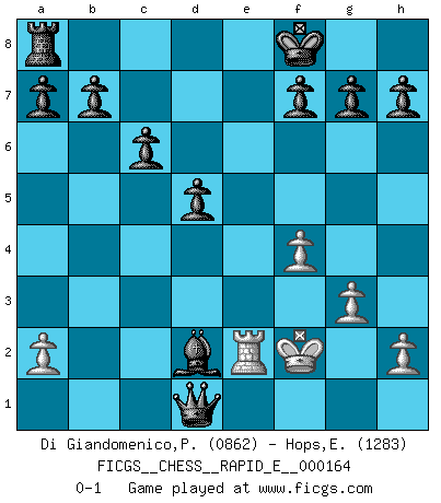 Last move : 0-1 2016 January 6 20:6:35 [Event "FICGS__CHESS__RAPID_E__000164"] [Site "FICGS"] [Date "2015.12.04"] [Round "1"] [White "Di Giandomenico,Pierino"] [Black "Hops,Erik"] [Result "0-1"] [WhiteElo "0862"] [BlackElo "1283"] 1.d4 d5 2.e3 Nf6 3.Bb5+ c6 4.Ba4 Bf5 5.Nf3 e6 6.O-O Bd6 7.Re1 O-O 8.Bd2 Nbd7 9.Nc3 e5 10.dxe5 Nxe5 11.Nxe5 Bxe5 12.e4 Nxe4 13.Be3 Nxc3 14.bxc3 Qh4 15.g3 Qxa4 16.f4 Bxc3 17.Rb1 Rfe8 18.Bd2 Bxc2 19.Rc1 Bxd1 20.Rcxd1 Rxe1+ 21.Rxe1 Bxd2 22.Re2 Qd1+ 23.Kf2 Kf8 0-1 Queen's pawn game Kingside Castling by player White (move 6) Kingside Castling by player Black (move 7) Player Black won this chess game. Follow this game move after move (download)The way he plays Chess demonstrates a man's whole nature. (Stanley Ellin) Konzentriere dich auf materielle Gewinne. Nimm, was dir dein Gegner gibt, ausser es gibt einen guten Grund der dagegenspricht. (Robert James Fischer) Combinaciones deslumbrantes son para la mayoría, mover madera es para los pocos. (Georg Kieninger) Votre prénom est 'Tactique', votre deuxième prénom est 'Tactique' et votre nom est 'Tactique'. (Ken Smith) Looking at the proliferation of personal web pages on the Net, it looks like very soon everyone on Earth will have 15 megabytes of fame. (M.G. Sriram)