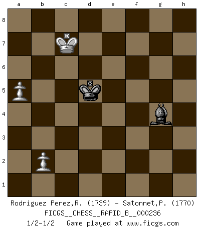Last move : 1/2-1/2 2016 May 31 13:38:8 [Event "FICGS__CHESS__RAPID_B__000236"] [Site "FICGS"] [Date "2015.12.07"] [Round "1"] [White "Rodriguez Perez,Rene"] [Black "Satonnet,Patrick"] [Result "1/2-1/2"] [WhiteElo "1739"] [BlackElo "1770"] 1.e4 e5 2.f4 exf4 3.Nf3 Be7 4.Bc4 Nf6 5.e5 Ng4 6.d4 Bh4+ 7.Kf1 Ne3+ 8.Bxe3 fxe3 9.Nc3 O-O 10.g3 Be7 11.Qd3 d6 12.Kg2 dxe5 13.Nxe5 Nd7 14.Qxe3 Nxe5 15.dxe5 Qd7 16.Rhf1 Qg4 17.Nd5 Bg5 18.Nf4 Bd7 19.Rae1 Bc6+ 20.Kg1 Kh8 21.e6 fxe6 22.Bxe6 Bxf4 23.Bxg4 Bxe3+ 24.Rxe3 Rxf1+ 25.Kxf1 Re8 26.Rxe8+ Bxe8 27.Ke2 g5 28.Ke3 Kg7 29.Bf5 h5 30.Kd4 Kf6 31.Be4 b6 32.Kd5 h4 33.Bd3 a5 34.c4 hxg3 35.hxg3 Bd7 36.a3 Be8 37.c5 bxc5 38.Kxc5 Ke5 39.Bb5 Bh5 40.Ba4 Ke4 41.Kb5 Ke3 42.Kxa5 Kf2 43.Bd7 Kxg3 44.a4 Kf4 45.Kb5 g4 46.Bxg4 Bxg4 47.Kc6 Ke5 48.Kxc7 Kd5 49.a5 1/2-1/2 KGA : Cunningham, Euwe defense Kingside Castling by player Black (move 9) 10 pieces endgame at move 38 : White KBPPP , Black KBPPP WHITE : King + 1 Bishop 3 Pawns BLACK : King + 1 Bishop 3 Pawns 9 pieces endgame at move 42 : White KBPPP , Black KBPP WHITE : King + 1 Bishop 3 Pawns BLACK : King + 1 Bishop 2 Pawns 8 pieces endgame at move 43 : White KBPP , Black KBPP WHITE : King + 1 Bishop 2 Pawns BLACK : King + 1 Bishop 2 Pawns 7 pieces endgame at move 46 : White KBPP , Black KBP WHITE : King + 1 Bishop 2 Pawns BLACK : King + 1 Bishop 1 Pawn 6 pieces endgame at move 46 : White KPP , Black KBP WHITE : King + 2 Pawns BLACK : King + 1 Bishop 1 Pawn 5 pieces endgame at move 48 : White KPP , Black KB WHITE : King + 2 Pawns BLACK : King + 1 Bishop This chess game ended in a draw. Follow this game move after move (download)Chess is war over the board. The object is to crush the opponents mind. (Bobby Fischer) Die Idee von Capablanca, Schach als Fach in den Schulen zu lehren, ist großartig. (Fidel Castro) Debemos de asegurarnos de que el Ajedrez no se convierta en un lenguaje muerto, muy interesante, pero solo para un grupo muy pequeño. (Sytze Faber) Le joueur d'Echecs qui veut atteindre le top est obligé de développer son propre credo créatif. Alexeï Stepanovicth Souétine. Il est facile d'écrire des livres ! Ce qui est difficile, c'est de jouer ! (Alexeï Stepanovicth Souétine) Watch your thoughts; they become words. Watch your words; they become actions. Watch your actions; they become habits. Watch your habits; they become character. Watch your character; it becomes your destiny. (Frank Outlaw)