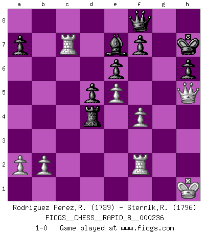 Last move : 1-0 2016 February 16 17:4:16 [Event "FICGS__CHESS__RAPID_B__000236"] [Site "FICGS"] [Date "2015.12.07"] [Round "1"] [White "Rodriguez Perez,Rene"] [Black "Sternik,Ryszard"] [Result "1-0"] [WhiteElo "1739"] [BlackElo "1796"] 1.e4 c6 2.d4 d5 3.e5 Bf5 4.Nf3 e6 5.Be2 Ne7 6.O-O Nd7 7.Nh4 c5 8.c3 Be4 9.Nd2 Nc6 10.Nxe4 dxe4 11.g3 cxd4 12.cxd4 Be7 13.Ng2 O-O 14.Be3 Nb6 15.Kh1 g5 16.h4 gxh4 17.gxh4 Bxh4 18.Bb5 Be7 19.Bxc6 bxc6 20.Bh6 Kh8 21.Bxf8 Qxf8 22.Qh5 Rd8 23.f3 e3 24.Nxe3 Rxd4 25.f4 Nd5 26.Nxd5 cxd5 27.Rf2 h6 28.Rc1 Kh7 29.Rc7 1-0 Caro-Kann : Advance variation Kingside Castling by player White (move 6) Kingside Castling by player Black (move 13) Player White won this chess game. Follow this game move after move (download)You can only get good at Chess if you love the game. (Bobby Fischer) Schach ist ein Reich, wo sich die menschliche Phantasie frei entfalten kann. (David Bronstein) La última cosa en que Fischer estaba interesado era en tonterías, siempre y cuando el Ajedrez estuviera involucrado. (Elie Agur) Aux échecs, l'amour-propre est satisfait quand on remporte la victoire, mais il n'y a pas de honte à être battu. (Benjamin Franklin) If only people were all showed a certain minimum level of niceness; if only people didn't retract verbal draw offers (without draw box ticked) on ficgs; if only people didn't kill; if only people didn't run concentration / extermination camps, if only people didn't drop nuclear bombs on Hiroshima and Nagasaki, and so on - it would be a much more beautiful world. But sadly, things are not so... (Normajean Yates)