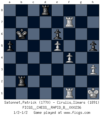 Last move : 1/2-1/2 2016 January 19 13:50:39 [Event "FICGS__CHESS__RAPID_B__000236"] [Site "FICGS"] [Date "2015.12.07"] [Round "1"] [White "Satonnet,Patrick"] [Black "Cirulis,Ilmars"] [Result "1/2-1/2"] [WhiteElo "1770"] [BlackElo "1891"] 1.e4 a6 2.Nf3 e6 3.d4 d5 4.e5 c5 5.c3 Ne7 6.Na3 Bd7 7.Be2 Nbc6 8.O-O Nf5 9.Nc2 Be7 10.dxc5 Bxc5 11.Bd3 Nh4 12.Bf4 Nxf3+ 13.Qxf3 g5 14.Bg3 h5 15.h4 gxh4 16.Bf4 Be7 17.Kh1 Bg5 18.Bh2 Qc7 19.Qe2 O-O-O 20.f4 Be7 21.b4 Kb8 22.a4 h3 23.gxh3 d4 24.b5 dxc3 25.Bg1 Nb4 26.Nxb4 Bxb4 27.Qe3 b6 28.Qxb6+ Qxb6 29.Bxb6 Bc6+ 30.bxc6 Rxd3 31.Rad1 Rd2 32.Rb1 Rb2 33.c7+ Kb7 34.Bd4 Kxc7 35.Rbc1 Rd8 36.Bxc3 Bxc3 37.Rxc3+ Kb6 38.a5+ Kxa5 39.Rc7 Kb6 40.Rxf7 a5 1/2-1/2 St. George (Baker) defense Kingside Castling by player White (move 8) Queenside Castling by player Black (move 19) This chess game ended in a draw. Follow this game move after move (download)Any material change in a position must come about by mate, a capture, or a Pawn promotion. (Purdy) Alle offensichtlichen Züge sehen nach dem Spiel in der Analyse verdächtig aus. (Viktor Kortschnoi) Combinaciones deslumbrantes son para la mayoría, mover madera es para los pocos. (Georg Kieninger) Dans le domaine de la peinture, de la gravure et de la sculpture, dès la première décennie de notre siècle, les artistes abandonnent la représentation de la partie d'échecs pour se concentrer sur les pièces, sur les échiquiers et sur toutes les variations auxquelles les unes et les autres peuvent donner lieu. On passe en quelque sorte d'un thème social à un thème musical (au sens de la musica médiévale, c'est-à-dire d'une notion qui inclue le rythme, l'harmonie, la construction et la déconstruction, etc.). Graphiquement et picturalement, l'échiquier apparaît comme une structure ouverte, dynamique, d'une richesse infinie, autorisant toutes les combinatoires et débouchant sur des mouvements et des rythmes de nature exponentielle. (Michel Pastoureau) I don't diet. I just don't eat as much as I'd like to. (Linda Evangelista, supermodel)