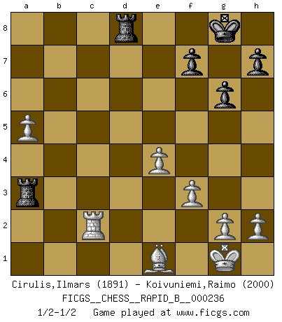 Last move : 1/2-1/2 2016 February 5 12:5:34 [Event "FICGS__CHESS__RAPID_B__000236"] [Site "FICGS"] [Date "2015.12.07"] [Round "1"] [White "Cirulis,Ilmars"] [Black "Koivuniemi,Raimo"] [Result "1/2-1/2"] [WhiteElo "1891"] [BlackElo "2000"] 1.b4 e5 2.a3 Nf6 3.Bb2 d6 4.c4 a5 5.b5 Be7 6.e3 c6 7.Nc3 O-O 8.Qc2 cxb5 9.Nxb5 g6 10.Be2 Na6 11.Nf3 Bf5 12.Qd1 Nc7 13.Nc3 Ne4 14.O-O Bf6 15.d4 Qe7 16.Na4 b5 17.cxb5 Rab8 18.Bd3 Nxb5 19.Rc1 Rfd8 20.Qe2 Qe8 21.Rfe1 Na7 22.Rc4 Be6 23.Nc3 Bg7 24.Nxe4 Bxc4 25.Bxc4 d5 26.Bxd5 Rxd5 27.Nxe5 R5d8 28.Bc3 Nc6 29.Nxc6 Qxc6 30.Nc5 Rb5 31.Rc1 Bf8 32.a4 R5b8 33.Bxa5 Rd5 34.Qc2 Bxc5 35.Be1 Rc8 36.a5 Qd6 37.Qb3 Rb8 38.dxc5 Rxb3 39.cxd6 Rxd6 40.e4 Rd8 41.f3 Ra3 42.Rc2 1/2-1/2 Polish (Sokolsky) opening Kingside Castling by player Black (move 7) Kingside Castling by player White (move 14) This chess game ended in a draw. Follow this game move after move (download)You sit at the board and suddenly your heart leaps. Your hand trembles to pick up the piece and move it. But what Chess teaches you is that you must sit there calmly and think about whether it's really a good idea and whether there are other better ideas. (Stanley Kubrick) Moralische Siege zählen nicht. (Savielly Grigorievitsch Tartakower) El ganador de una partida es aquel jugador que hace el penúltimo error. (Savielly Tartakover) Les sacrifices démontrent seulement que quelqu'un a gaffé. (Savielly Tartacover) You can't play chess if you're groggy from pills. (Anatoly Karpov)